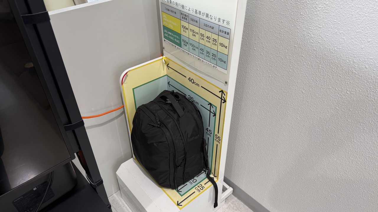 ついでに空港でサイズを測ってみると、30Lの拡張モードだと100席以下の機内持ち込み(緑の枠)は厳しそうでした。でも100席以上の機内持ち込み(黄色い枠)は余裕でOK。まあ余程の地方に飛ばない限り、100席以上の飛行機に乗ることになるので問題ないと思います。