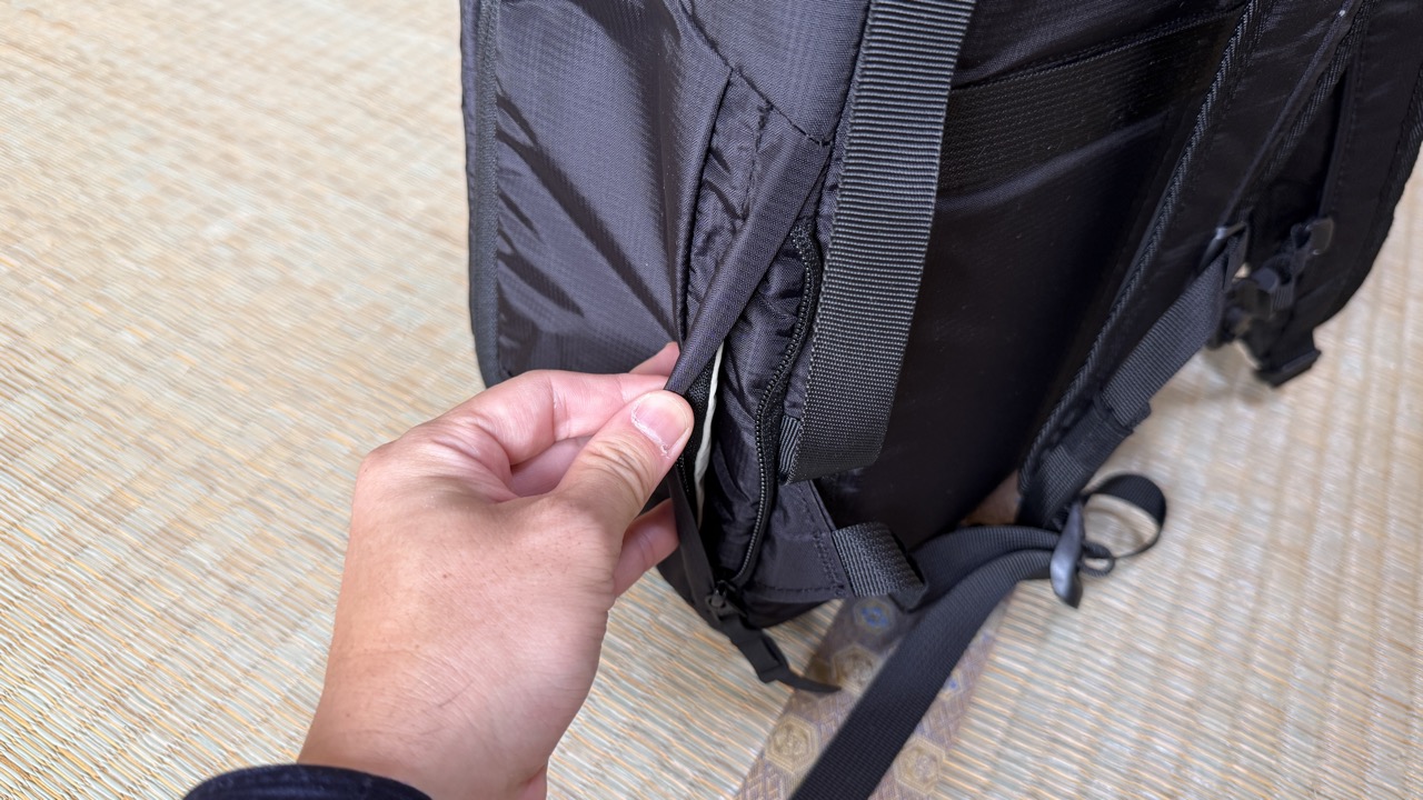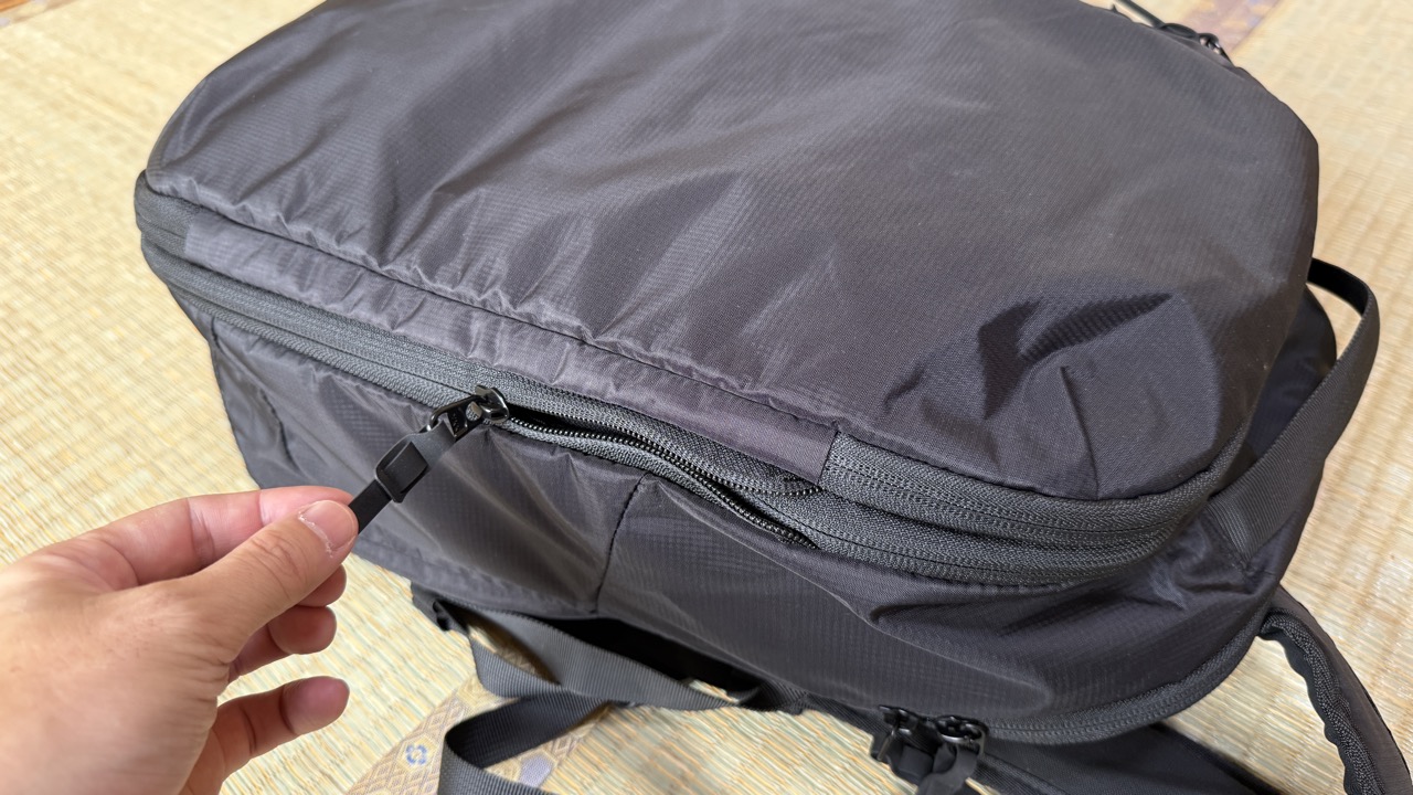 リュックの四方に張り巡らされたこちらのジッパーを全開すると拡張して30Lになり、閉じると25Lに戻ります。上の写真は25Lモード。パッと見では普通のリュックにしか見えないですよね。