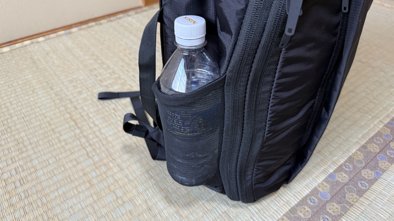 側面にはドリンクボトルが収納できるメッシュポケットを配置。使わない時はかさばらず邪魔になりません。