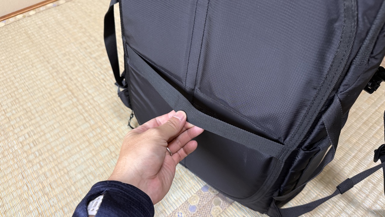 キャリーケースのハンドルに通せるパススルー機能もあります。リュックを横ではなく、縦に置けるのは個人的に嬉しいポイント。