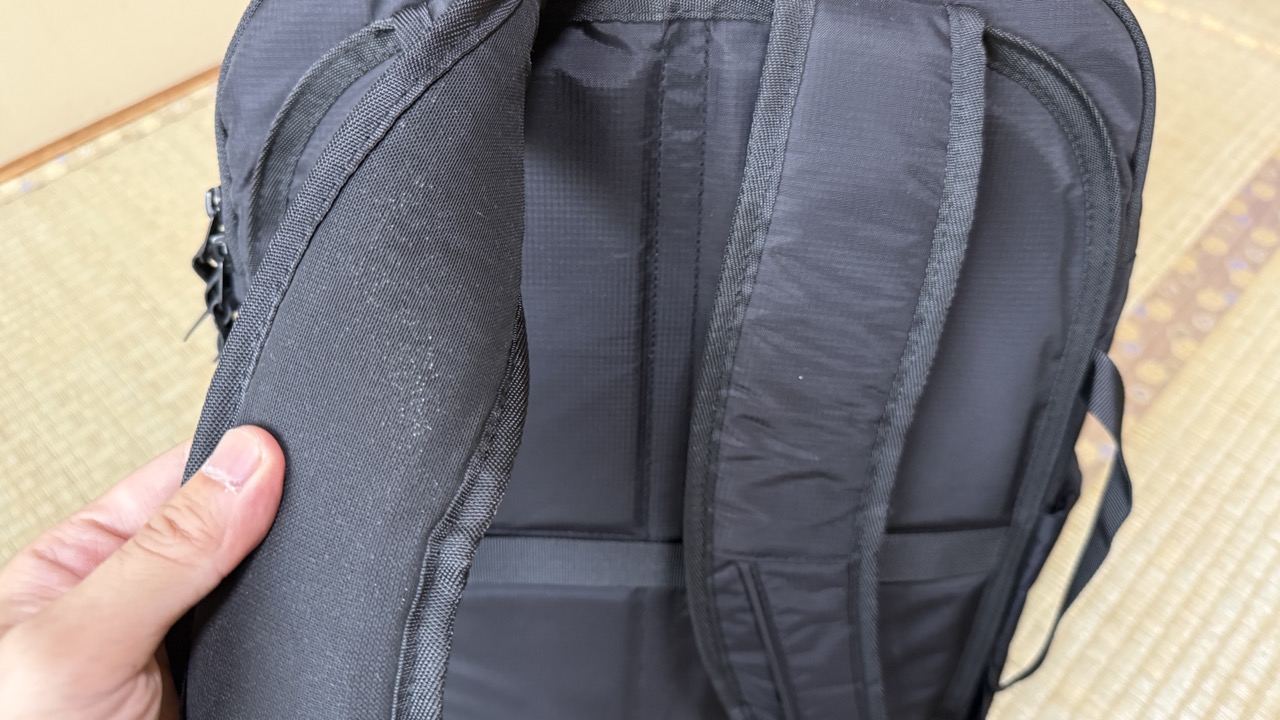 背中とショルダーハーネスの内側には、通気性に優れた薄手のパッドを配置しています。もう少し厚手だと嬉しかったのですが、ここは軽量性を重視しているのだと思います。