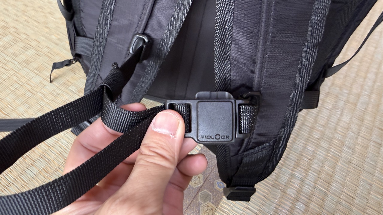 チェストストラップはサイズ調整が可能。磁石でピタッと接合でき、ボタンを押して解除。慣れるまでに時間がかかりますが、慣れてしまえば片手でも操作できます。