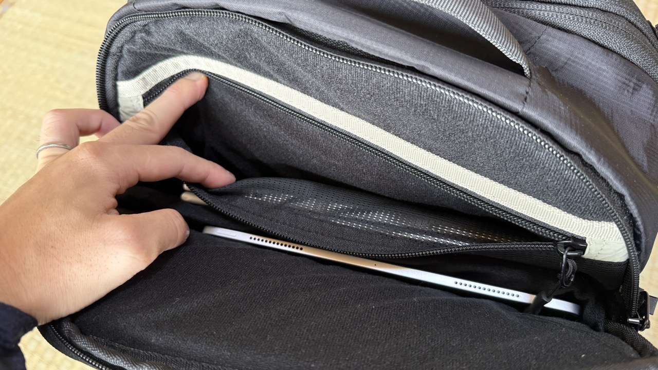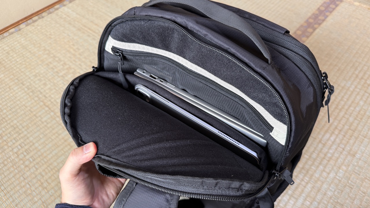 背中側にはノートパソコン(16インチまでOK)とタブレットを収納できるガジェット用収納スペースを配置。写真は14インチのノートパソコンと「iPad Pro M4 13インチ」を入れた状態。上部にはジッパー式ポケットもあります。