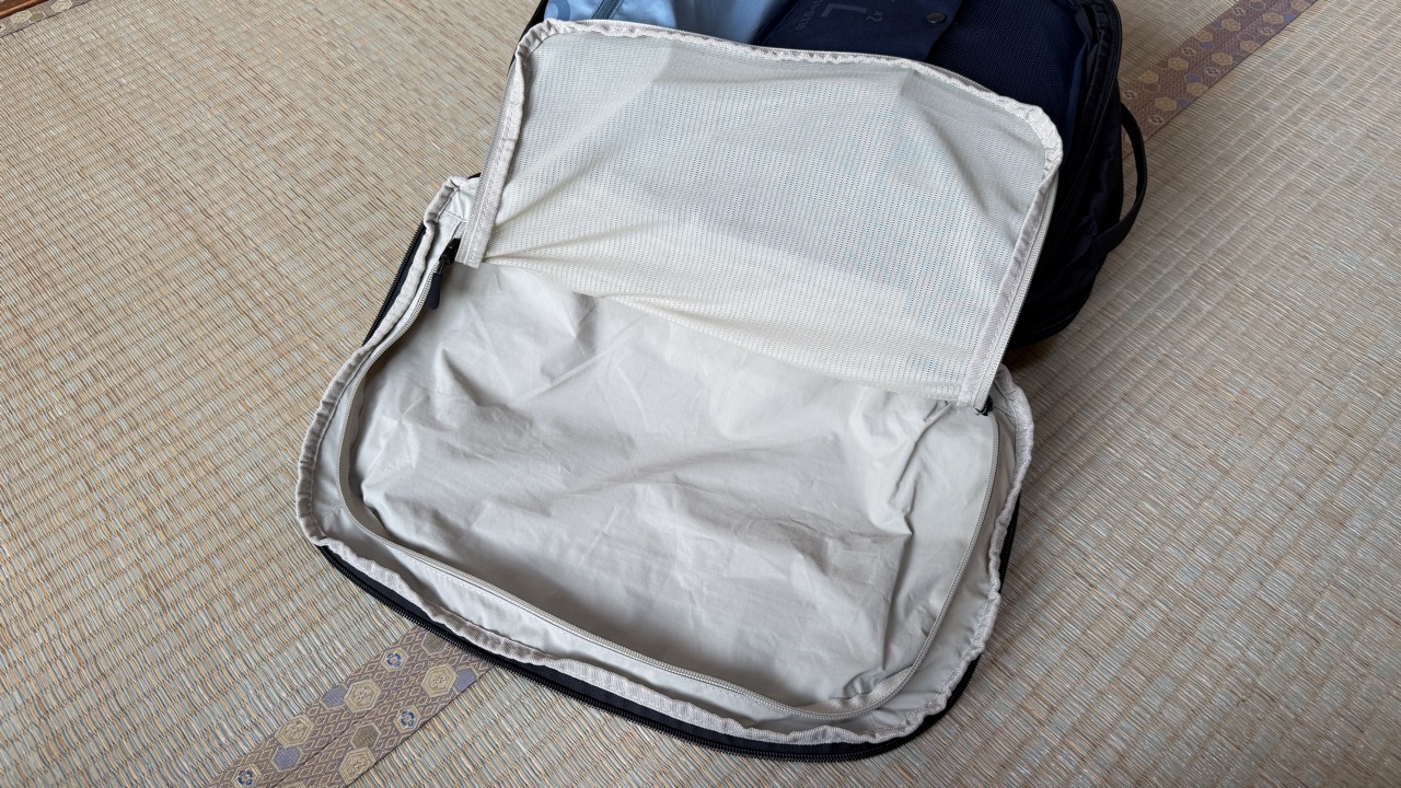 メイン収納の内側には大きなメッシュポケット。シャツやジャケットなどを畳んで保管するのに良さそう。
