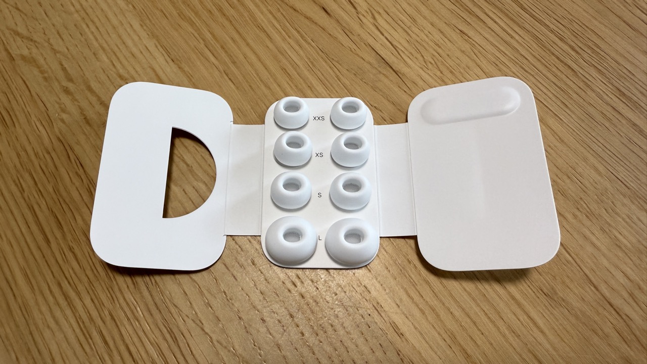 イヤーチップは、Mサイズがデフォルで装着されており、他にL、S、XS、XXSが付属します。素材が薄くて柔らかく、耳を完全に塞ぐのに圧迫感を感じない設計になっています。
