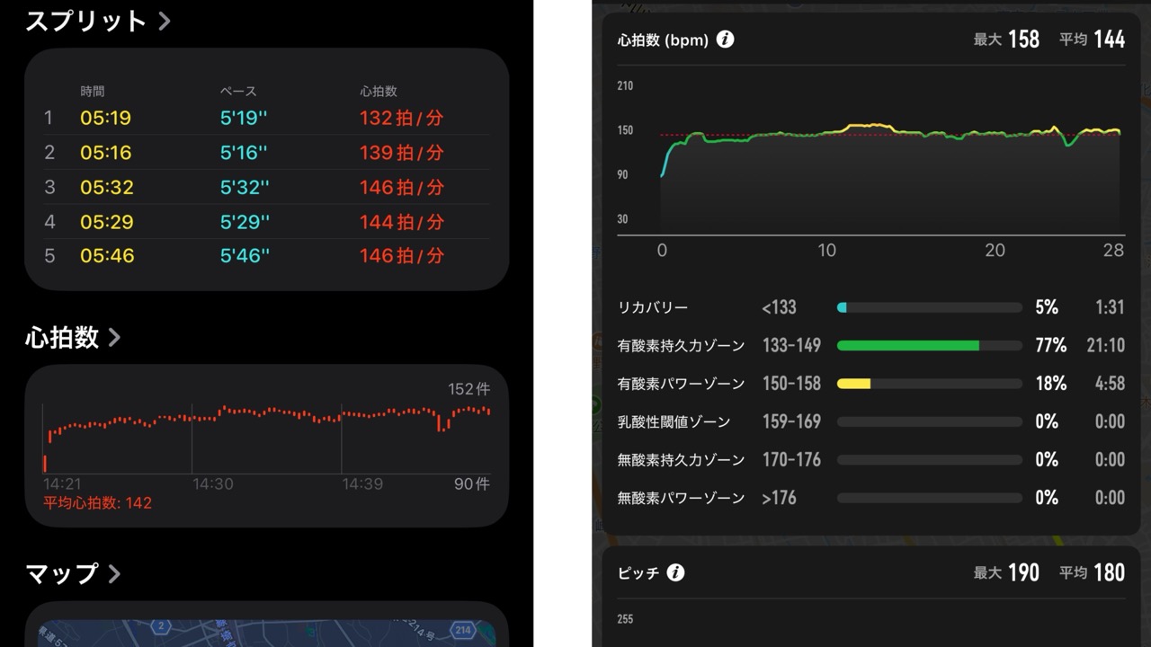 ワークアウトが終了すると、後からデータを確認することができます。5kmのランニングで心拍数の平均値が141、最高値が152、最低値が90でした。参考までにカロスのランニングウォッチ「ペース3」でも計測しましたが、心拍数は平均値が144、最高値が158、最低値が89でした。大きく乖離することなく、「AirPods Pro 3」の心拍数センサーの精度の高さが分かりました。