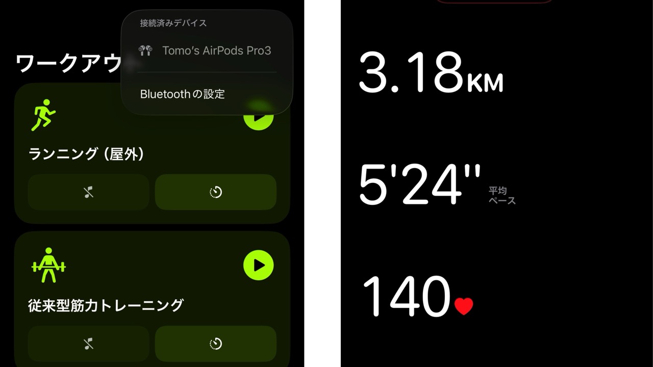 次に、iPhoneの「フィットネス」アプリを開き、ワークアウトを開始します。右上のイヤフォンをタップすると「AirPods Pro 3」がペアリングされているのが分かります。ランニングのワークアウトを選んでワークアウトを始めると、距離やペースの他、心拍数がリアルタイムで表示されます。