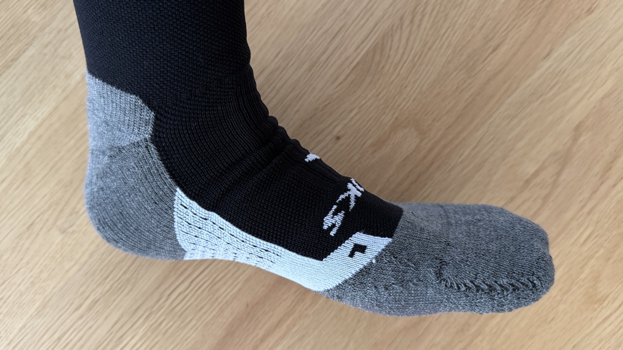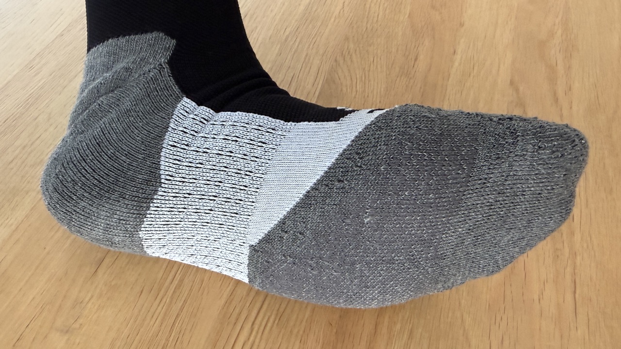 全体的に厚めの生地を使っていますが、ランニングで接地の際に衝撃を受けやすい、つま先とカカトの部分はクッション性のが強化されており、フカフカした感触がクセになりそうです。厚手のソックスが好きな方には刺さると思います。