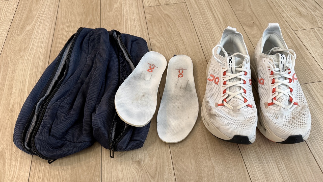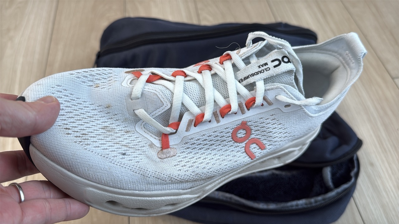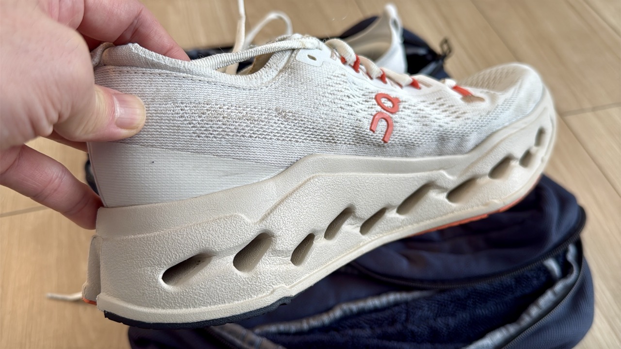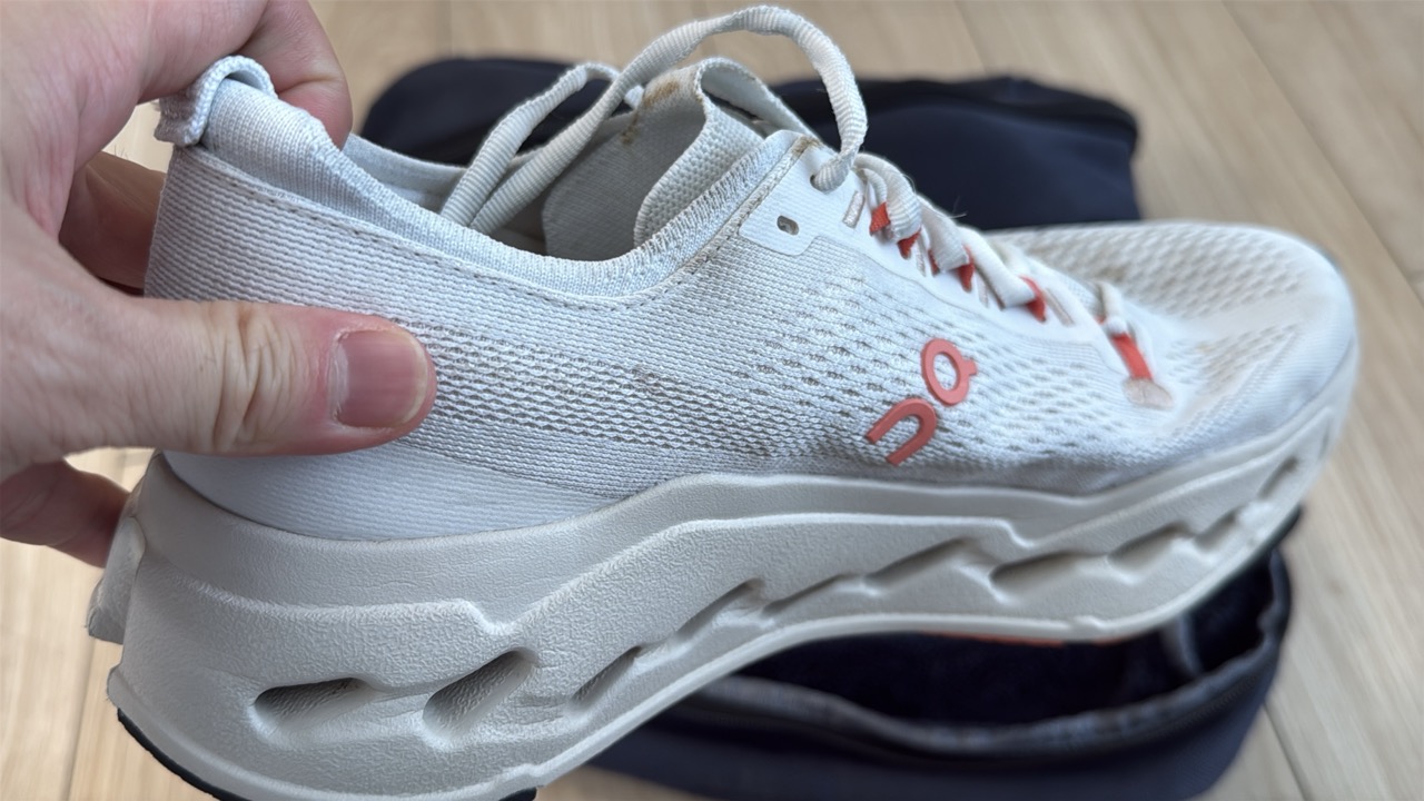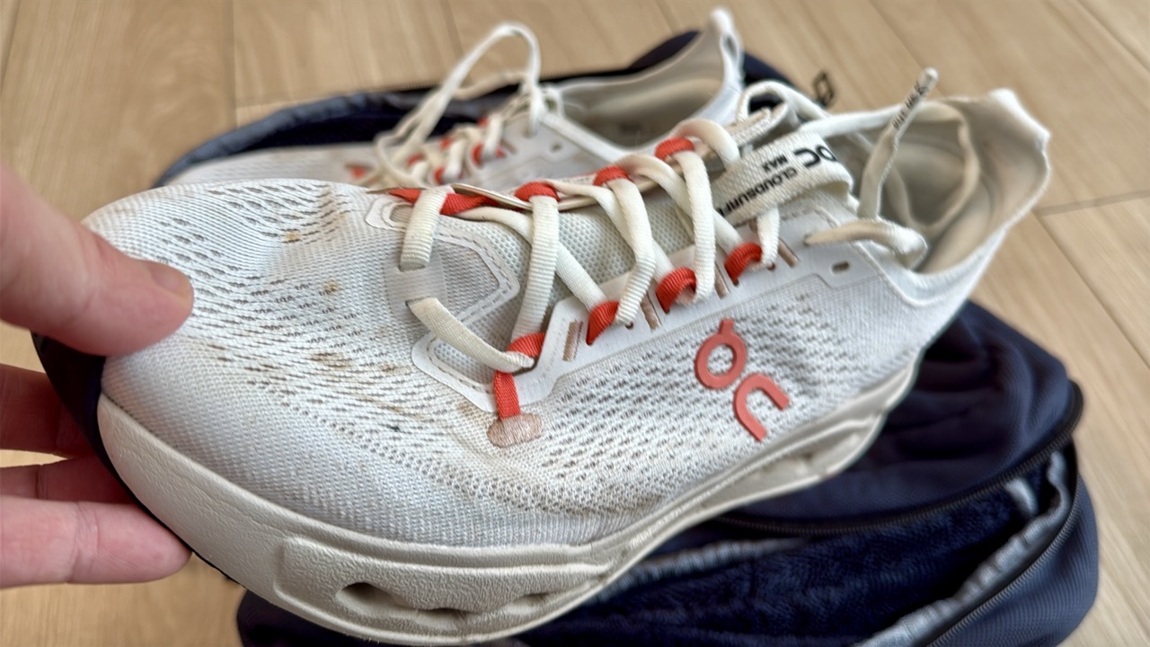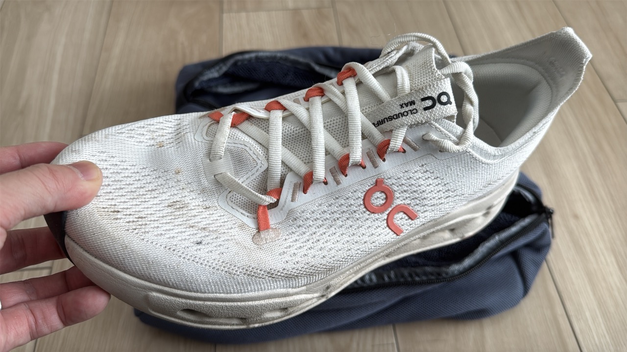 早速、私が所有するランニングシューズの中から、最も汚れが目立つONの「Cloudsurfer Max」を洗ってみたいと思います。300km以上走り込んでおり、年末に静岡県の浜名湖1周を走った時に泥で汚れたまま。