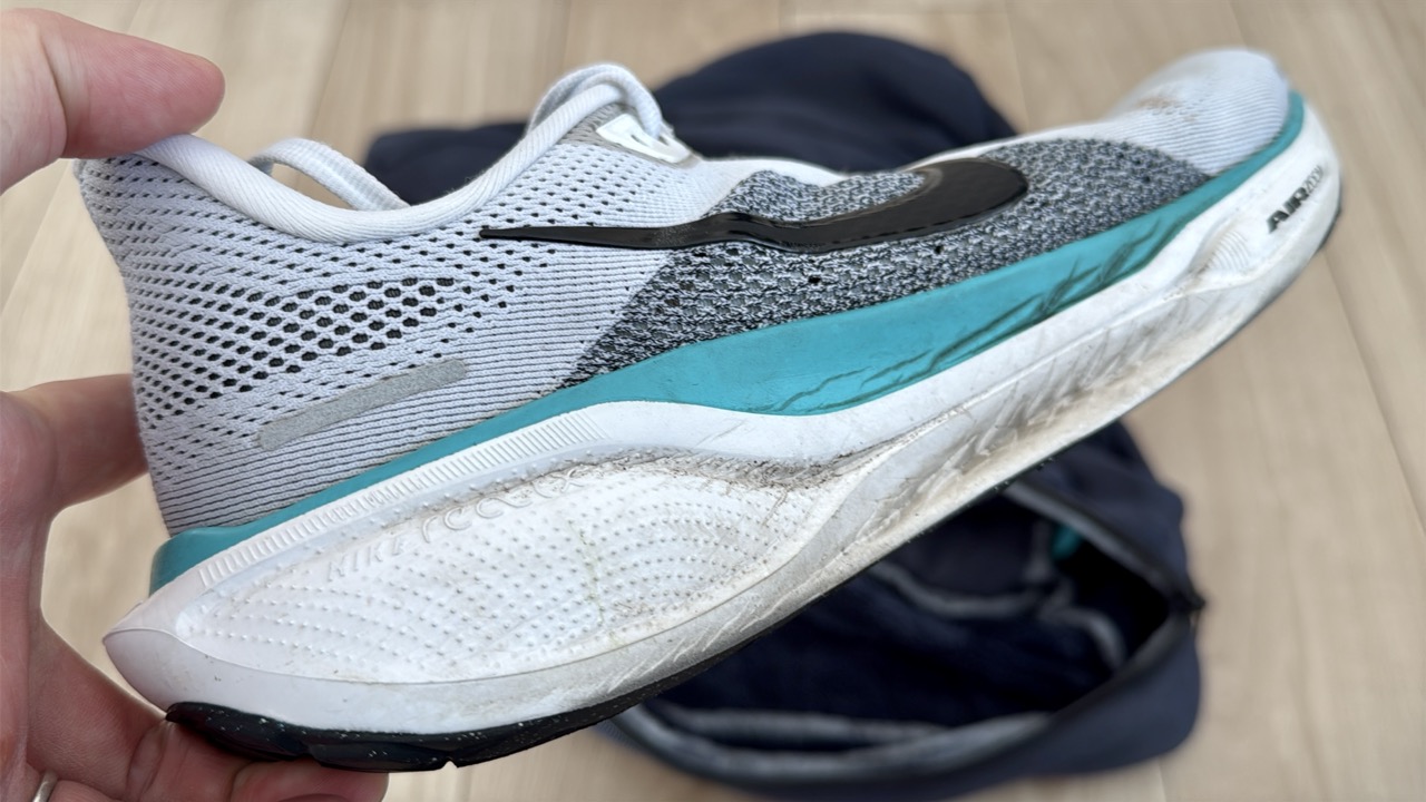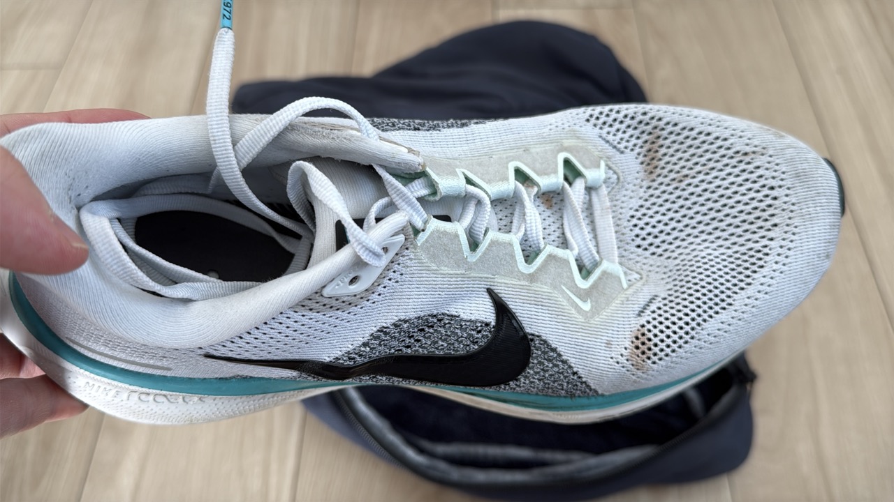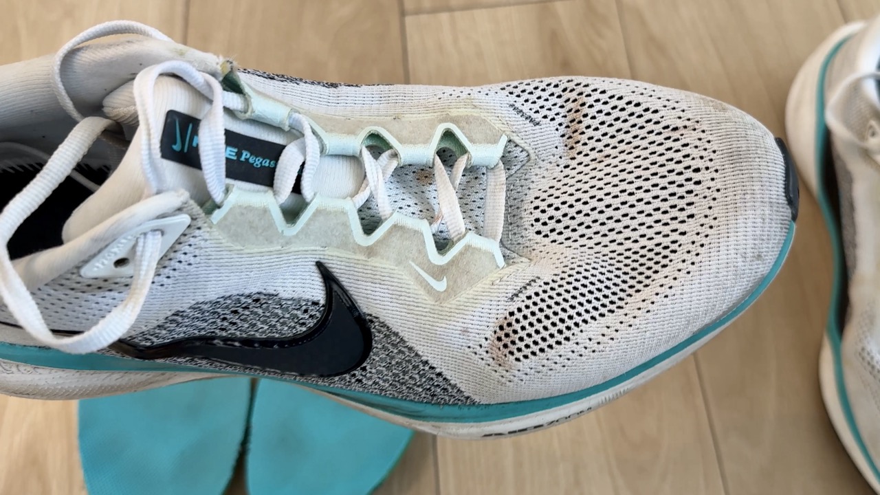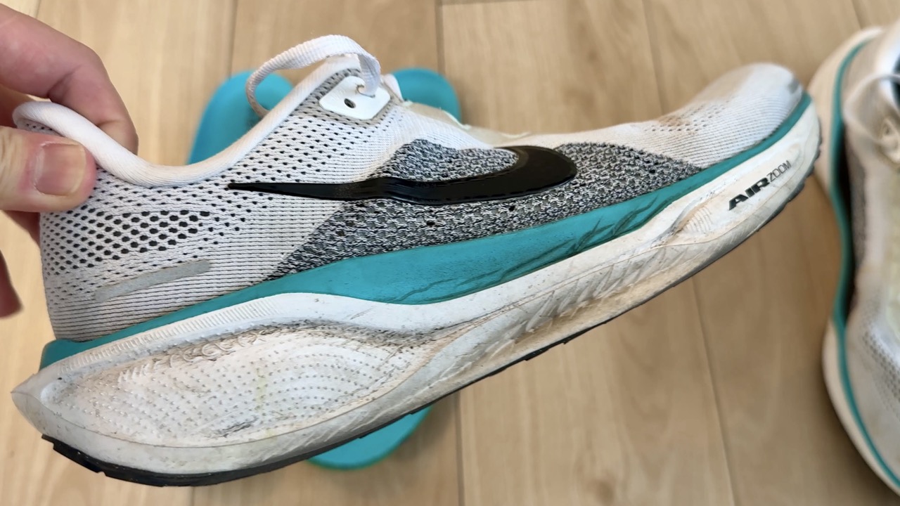 別のシューズでも試してみました。NIKEの「Pegasus 41」。こちらも300km以上走り込んでおり、白っぽいカラーなので汚れが目立ちます。アッパーだけでなく、ソールもかなり汚れています。