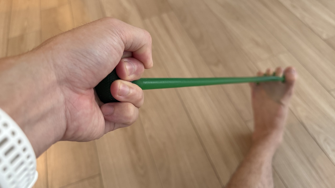 足指を引き寄せる動作は、一般的な足指セパレーターを装着して前屈みに立てば同じ効果が得られます。一方で足指を伸ばす動作は「フロッグハンド」でしかできないトレーニング。取っ手えお引っ張ることで適度な抵抗を加えられます。