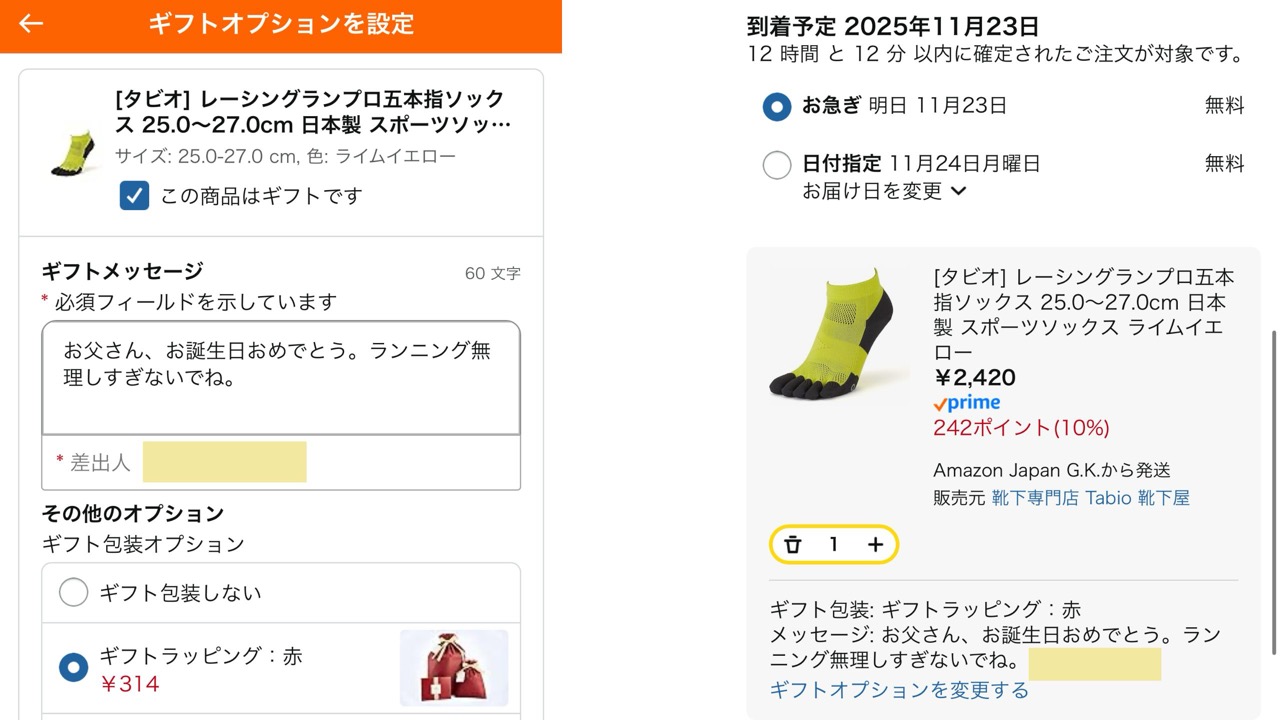 まず、私がランニング好きなのを分かった上で選んでくれたのが嬉しかったですね。実は既に同一商品を持っていましたが、ランニングソックスは消耗品なので何足あっても困りません。むしろお気に入りだったので「ランナーのこと良く分かってるな」と感心すらしました。