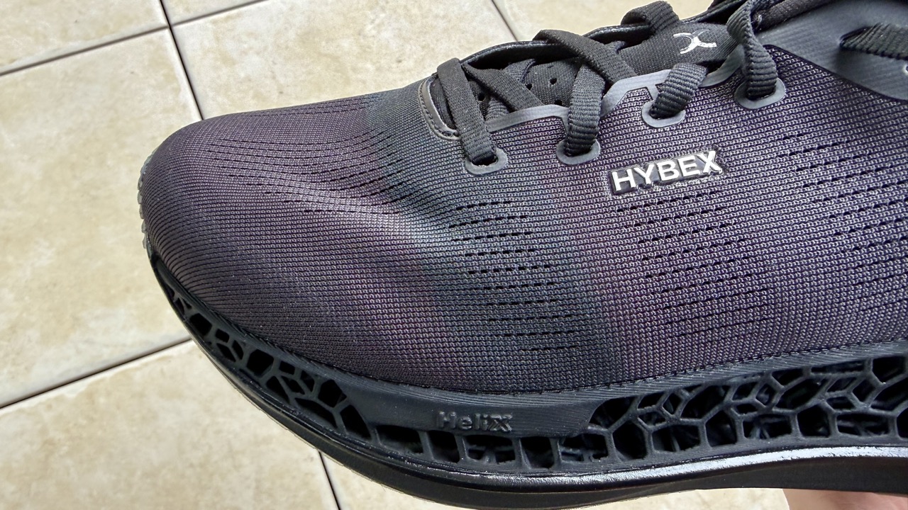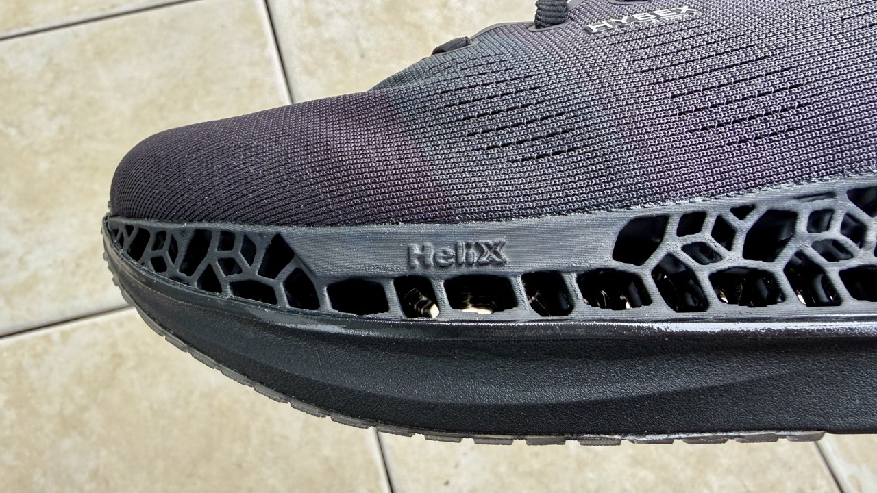 最大の特徴は、HYBEXのブランドのコアテクノロジーでありアイデンティティでもあるHelixソール。立体格子状の構造を持ち、着地の際にクシャッと潰れて衝撃を吸収。