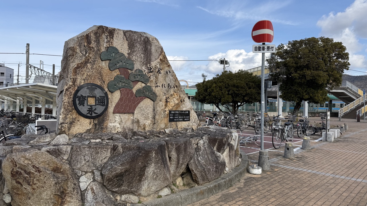観音寺駅周辺を走っていると、駅前広場やポケットパーク、橋など至る所で江戸時代の通貨「寛永通宝」を目にします。これは江戸時代、観音寺を訪れた丸亀藩主を歓迎するために、砂で「寛永通宝」を描いたことに由来します。