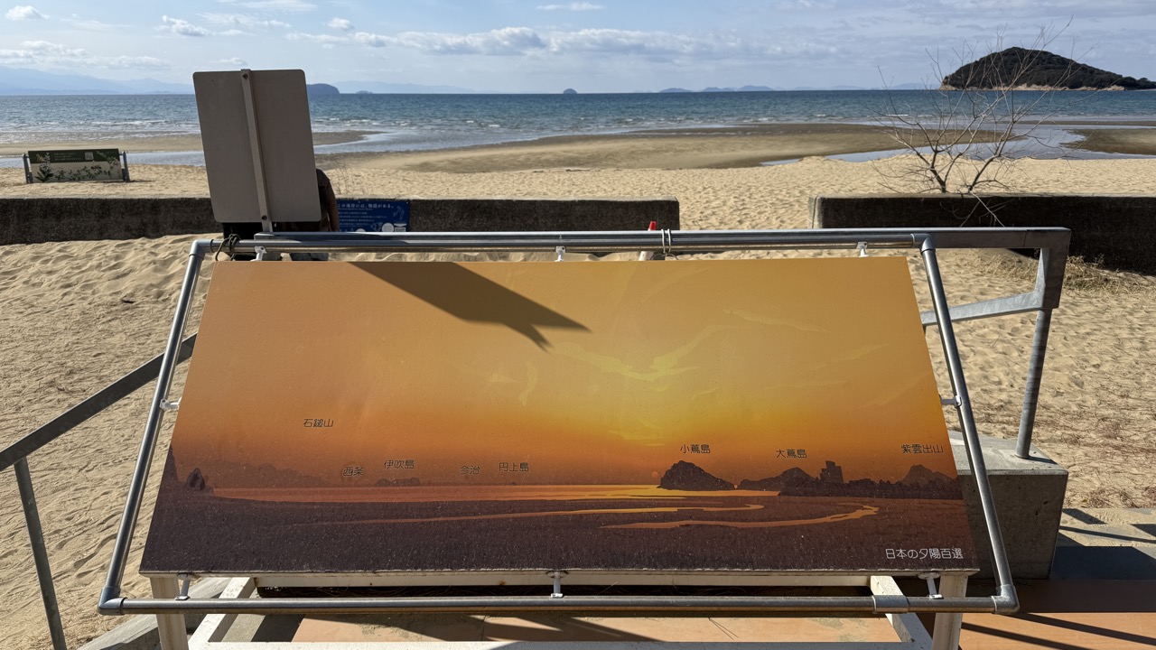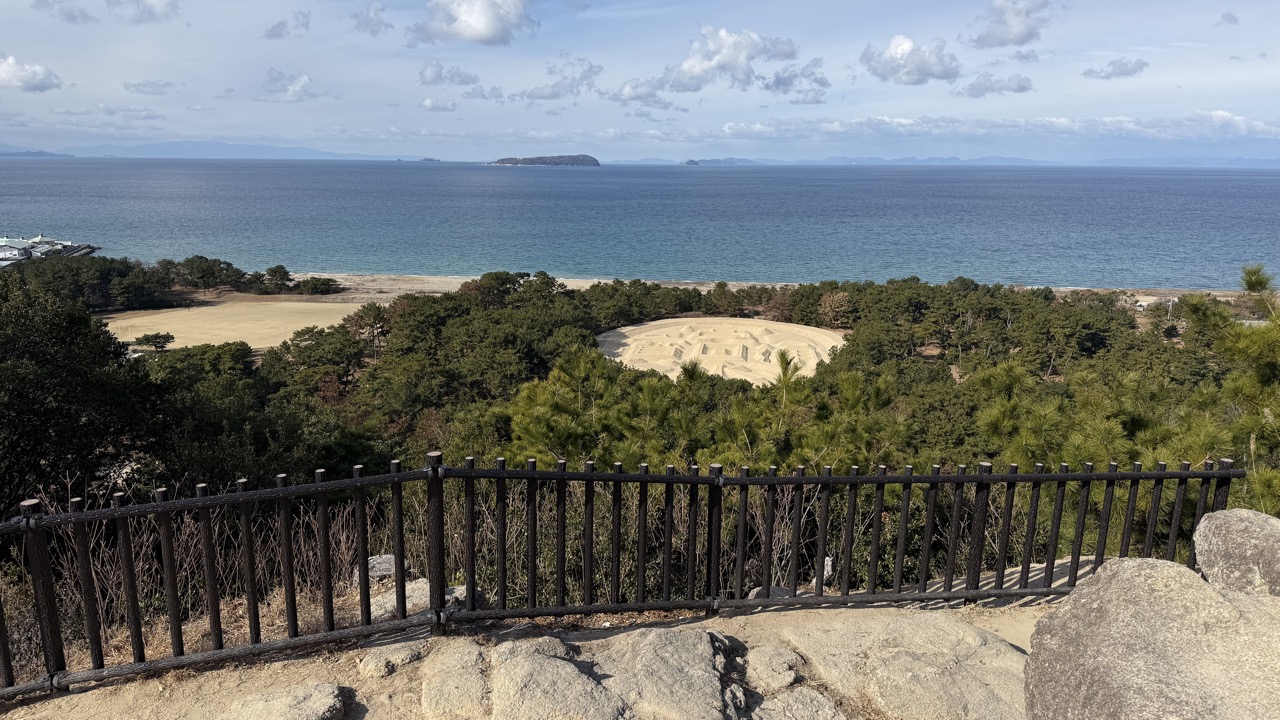 というわけで山道を進み展望台まで登ってきました。美しい瀬戸内海を背景に真っ白な砂浜に「寛永通宝」が浮かび上がります。なかなか面白いですね。