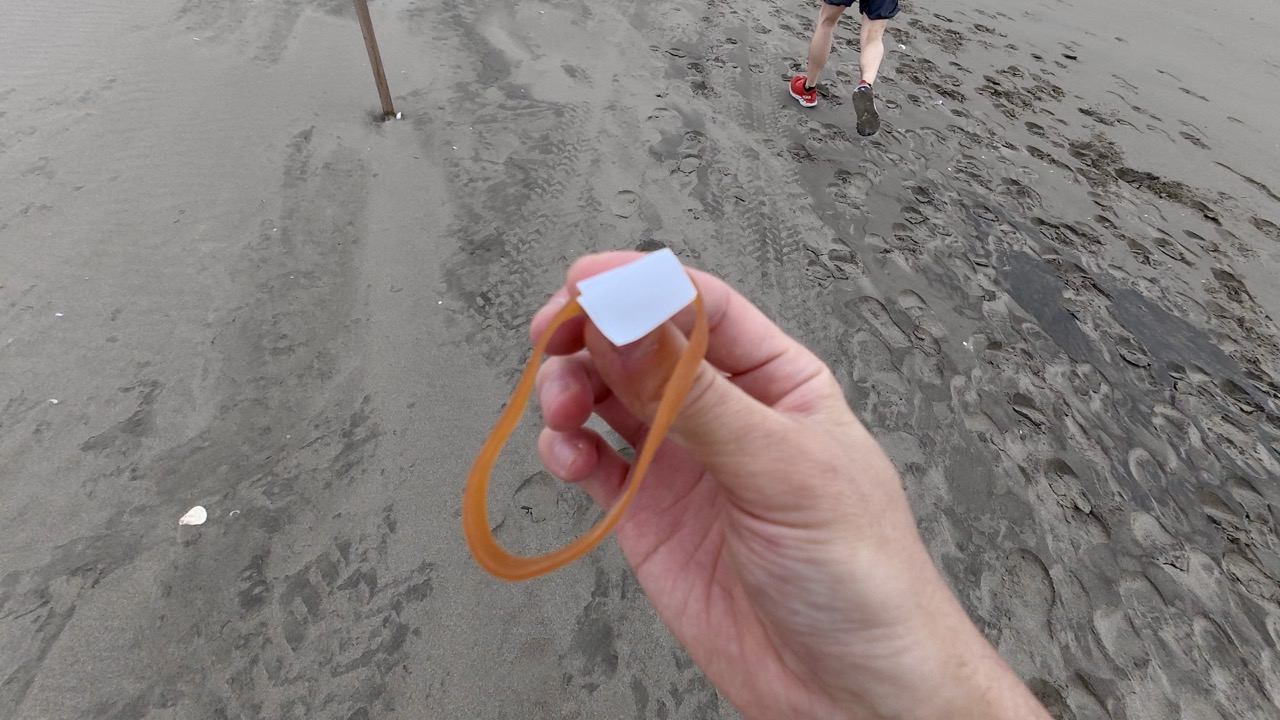 第一折り返し点ではスタッフの方が何かを配っていました。九十九里はまぐりマラソンは砂浜の上を走るため給水所がなく、参加者はドリンク携帯して走ります。飴玉でも貰えるのかな?と思ったら、渡されたのは輪ゴムでした。