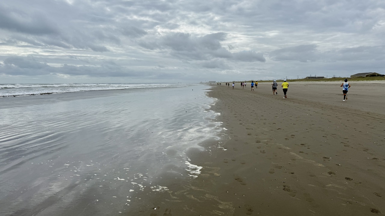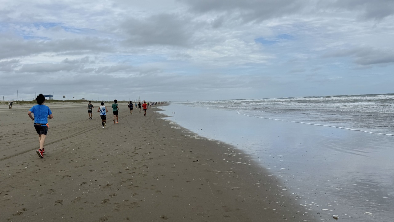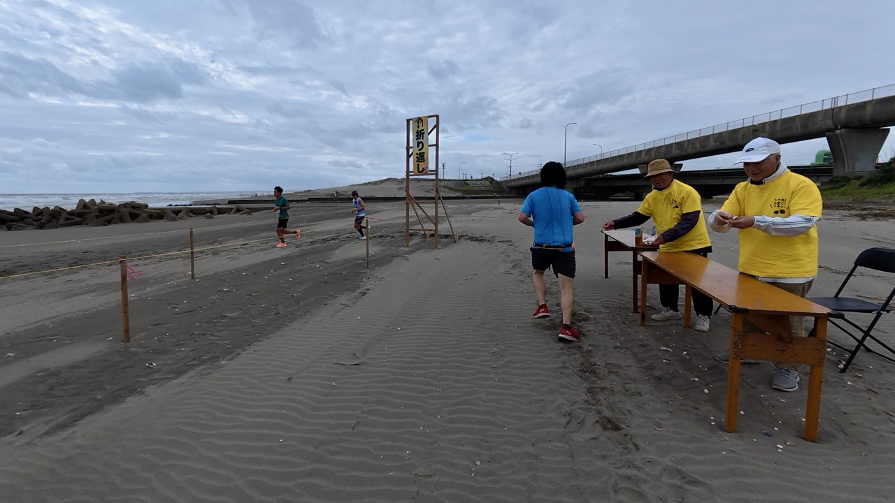 コースといっても、要所に目印がある程度で、基本的には折り返し点までの最短ルートで目指します。ただ、波打ち際の方が砂が湿って硬く、走りやすく感じました。スタートから第一折り返し点までは追い風にも助けられて4:15/kmぐらいペースで走行。