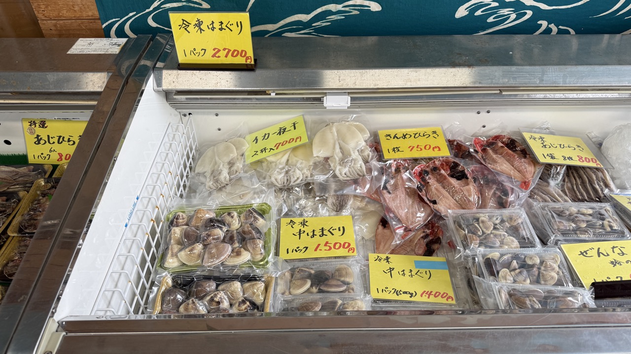 確かに販売していましたが、今日はもう売り切れでした。やっぱり今の時期は量が少ないのでしょうか…。冷凍のはまぐりは在庫がありました。一応、九十九里産なので、これを買って帰ります。