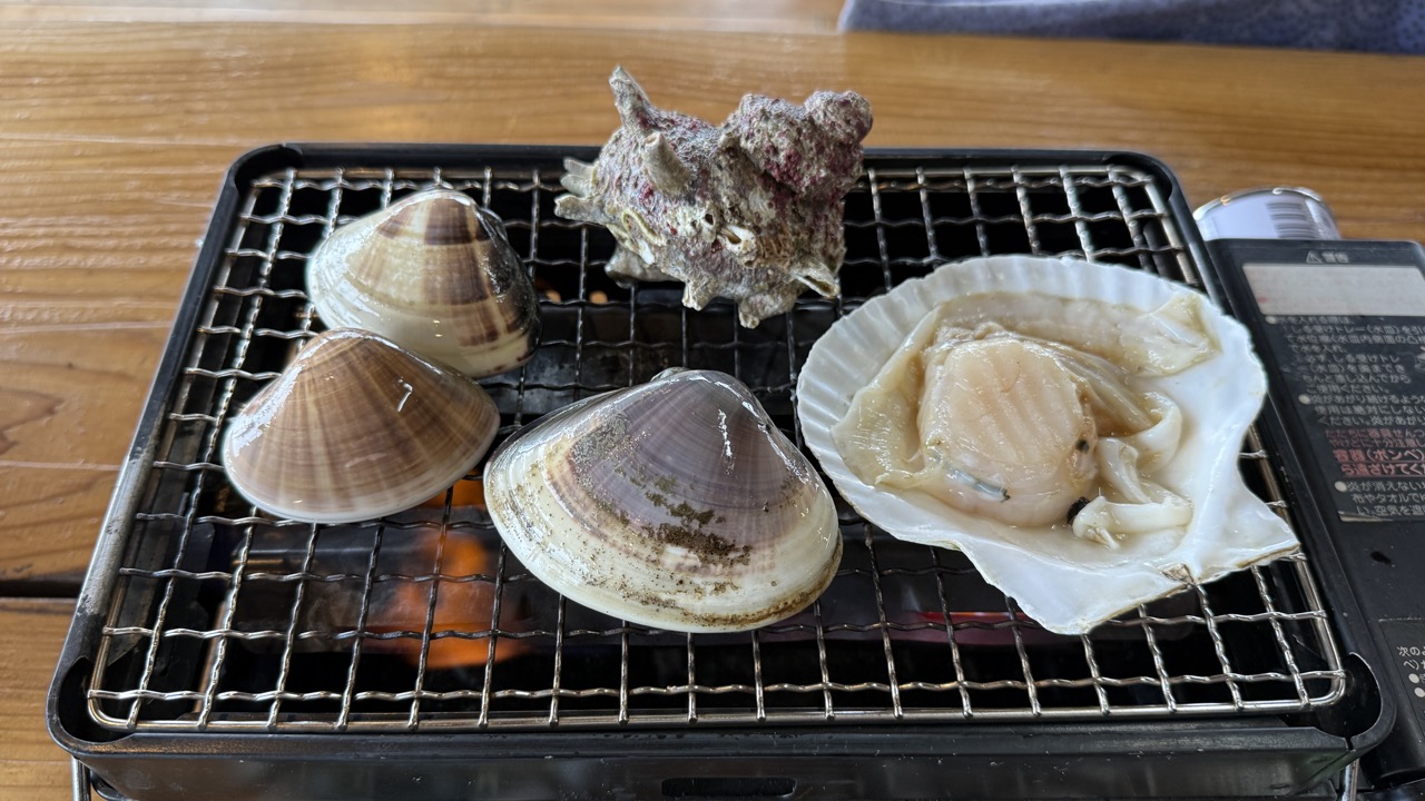 こちらは「焼き物御膳」。殻付きのサザエ、ホタテ、はまぐり(大・中・小)に、ご飯と味噌汁と副菜が付いて2,530円。はまぐりを単品で注文するよりもお得でした。