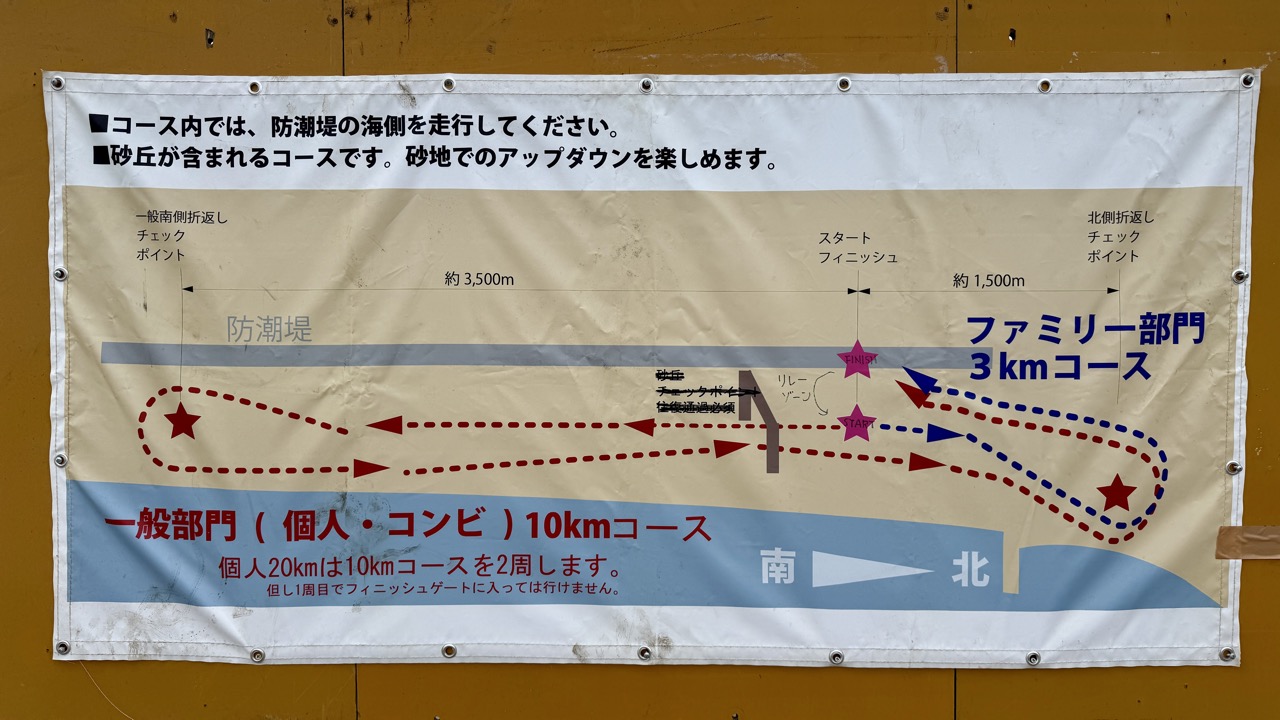 コースは九十九里浜の砂浜の上を走ります。まずスタート地点から南へ向かい、3.5km先の第一折り返し点まで往復。一旦スタート地点に戻ると、今度は1.5km先の第二折り返し点まで往復し、スタート地点と同じ場所でフィニッシュします。