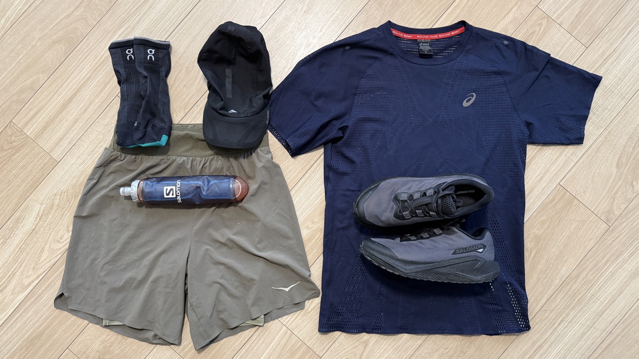 トップスはAsicsの「Metarun半袖シャツ」。10月に入り涼しくなりましたが、走るとまだまだ暑いですね。ボトムスはHokaの「スカイグライドショーツ」。タイツ内蔵で収納力が優れています。今回は給水ボトルを持って走らないといけないので、バックポケットに収納して走りました。