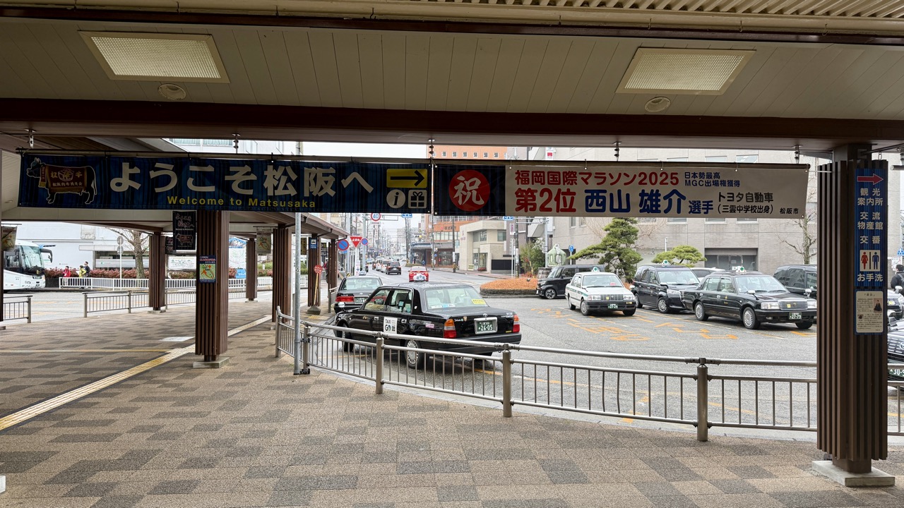 松阪駅南口にでると「ようこそ松坂へ」の「祝 福岡国際マラソン2025 第2位 西山雄介選手」の垂れ幕がお出迎え。西山選手は松阪市のご出身なんですね。