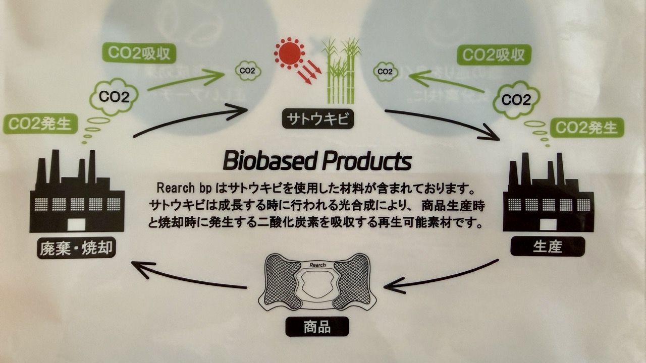 素材の質感は発泡スチロールに似ています。密度は低く、押すと適度なクッションと反発力を感じます。カーボンオフセットを意識して、サトウキビ由来の素材が使われています。肌触りの優しい素材ですが、強度はそんなに強くなさそう。