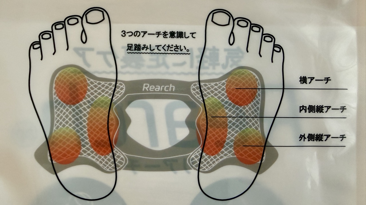 足踏みする時は、足裏の3つのアーチを「リアーチ」の突起に乗せるようにします。ツボ押しとは違い、足のアーチと突起を合わせるような感じです。