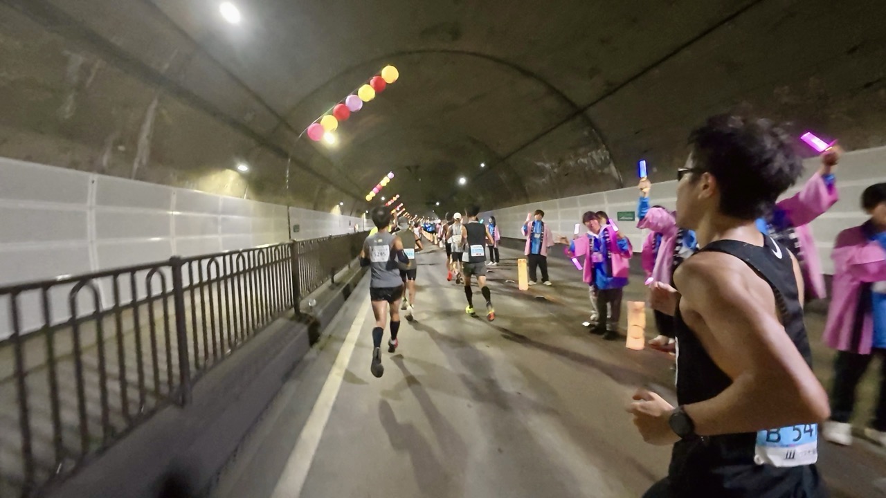 39km地点は「梅香トンネル」の中を走ります。ここは沿道の応援が凄くて勇気をもらいました。トンネルを出て「あと2km」の看板を通過した時に手元の時計を見ると2時間49分でした。意外とギリギリ。もっと「貯金」があったはずのに、ここでペースダウンしたらマズイな…と思い、ラスト2kmは全力で走りました。
