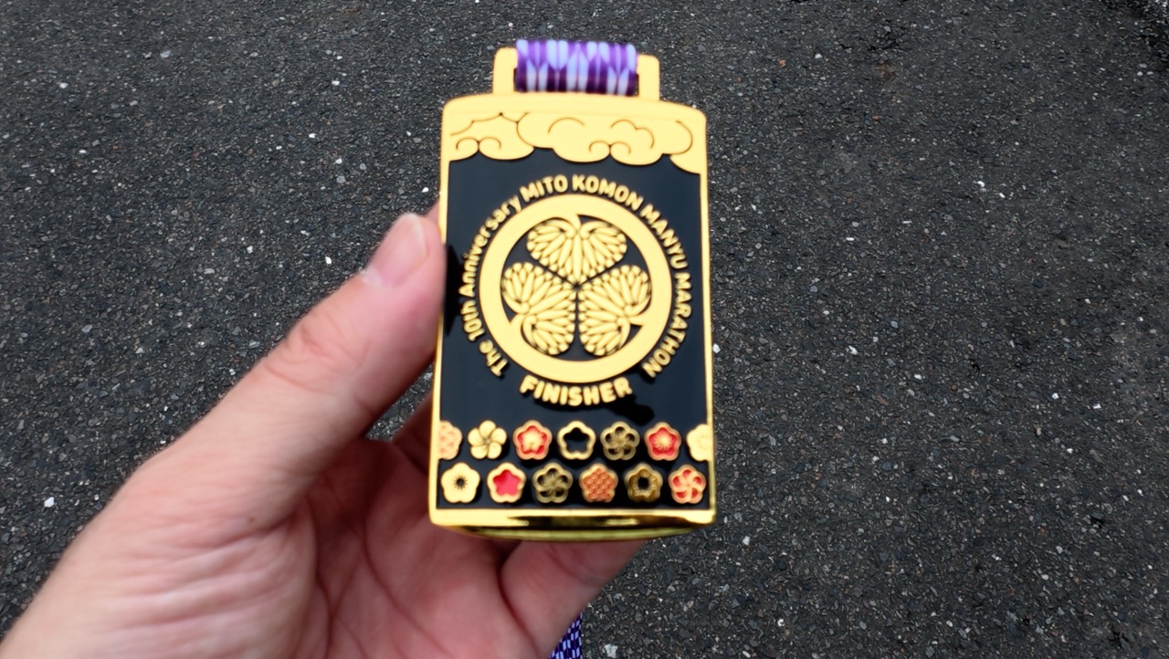 水戸黄門漫遊マラソンの完走記念メダルは、黄門様でお馴染みの「印籠」をモチーフにしており、この印籠メダルが前から欲しかったんですよね。これを最初に考えた人、めちゃくちゃセンス良いなと思います。
