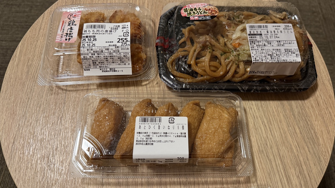 焼きうどん、いなり寿司、鳥の唐揚げ。これで1,200円ぐらい。トータルで1,000kcalほどローディングしました。あとはドーミーイン名物のアイスと、プロテインドリンクと鉄分ゼリーを摂取して、22時までに就寝しました。ドーミーイン名物の「夜泣きそば」は油っこいので止めておきました。