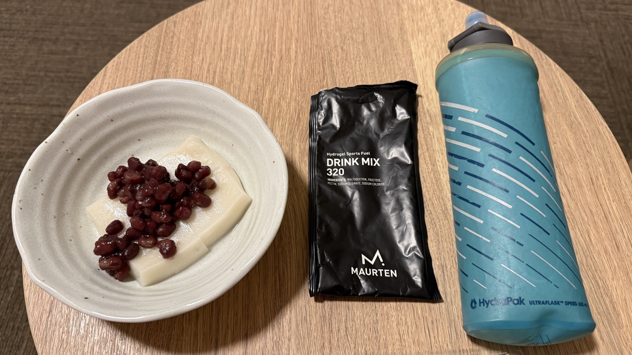 朝食は自宅から持ってきたお餅2個とぜんざい少々。そしてフルマラソンの時にいつも飲んでいるモルテンドリンク。10分ぐらいで食べ終わると、7時半まで二度寝します。その後、レースウェアに着替え、30分ほどかけてストレッチしていきます。トイレ(大小)も済ませて準備バッチリ。