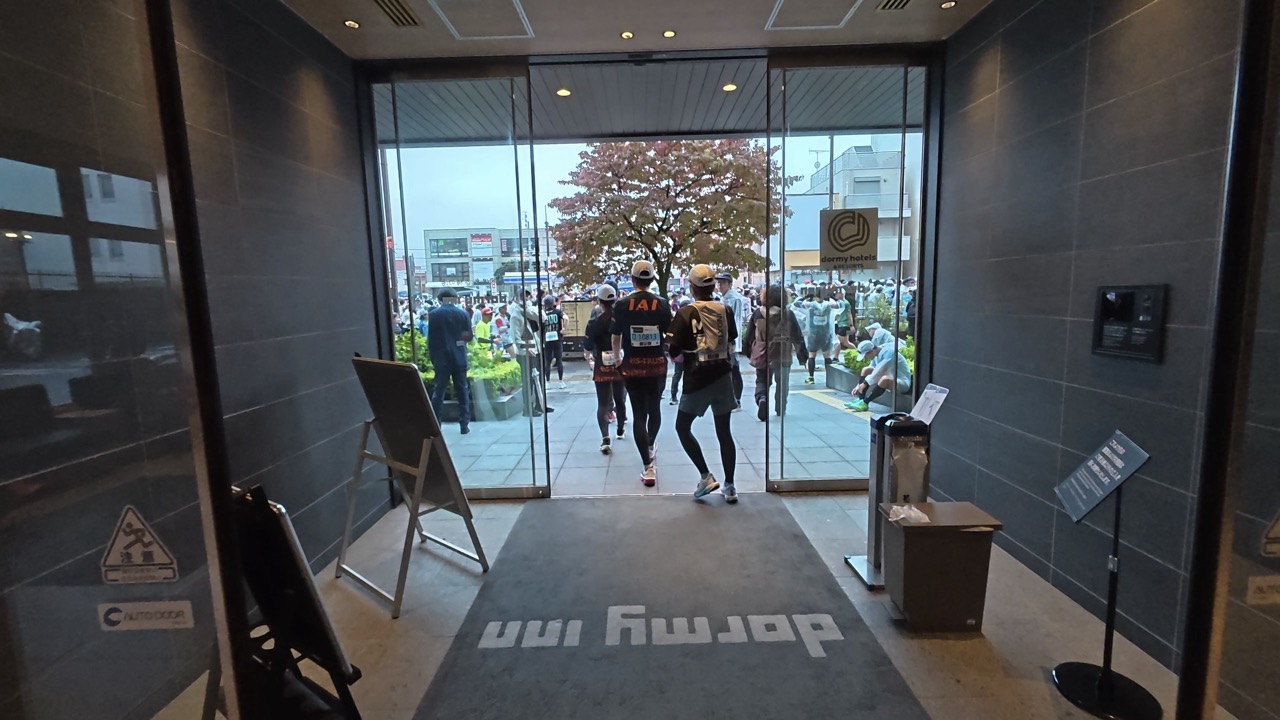 今回泊まった「ドーミーイン水戸」の最大のメリットは、水戸黄門漫遊マラソンのスタートブロックの目の前にあること。エントランスを出るとすぐにBブロック。私のAブロックまで歩いて20秒。スタートブロック整列の締切は8時50分なのですが、8時45分に滑り込みました。スタート直前まで部屋でゆっくり出来るのは最高です。