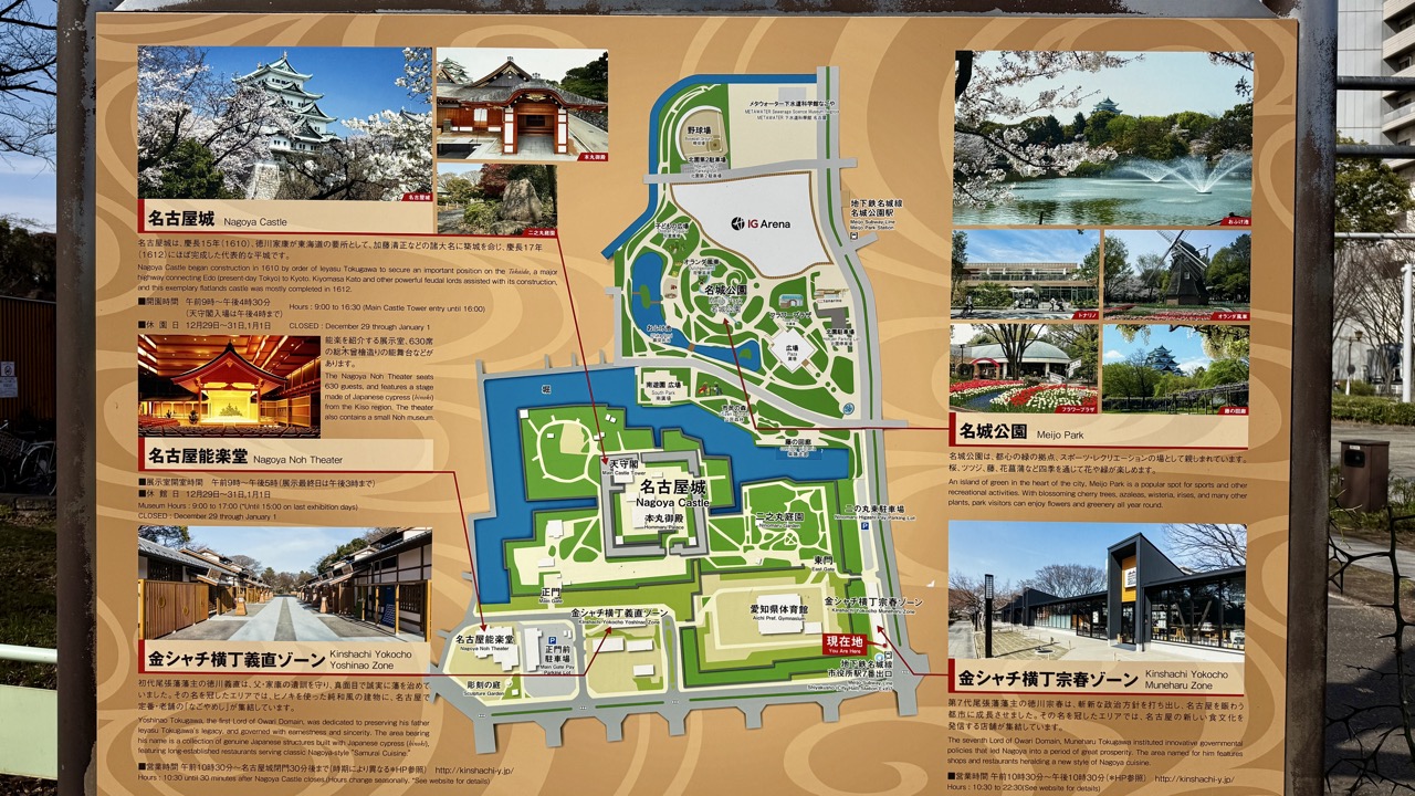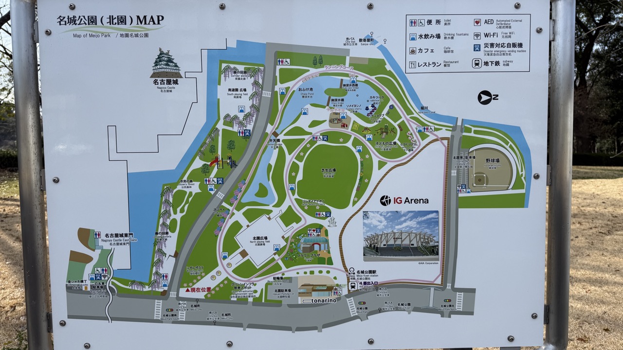 まずは地下鉄名城線の名古屋駅で下車して、名古屋城の東口へ向かいました。現地の案内マップで名城公園の概要をチェック。南側が名古屋城のあるエリアで、北側が芝生広場なのがある公園。南北を行き来するには横断を渡る必要があるため、南北合わせてノンストップで1周するのは難しそうですね。