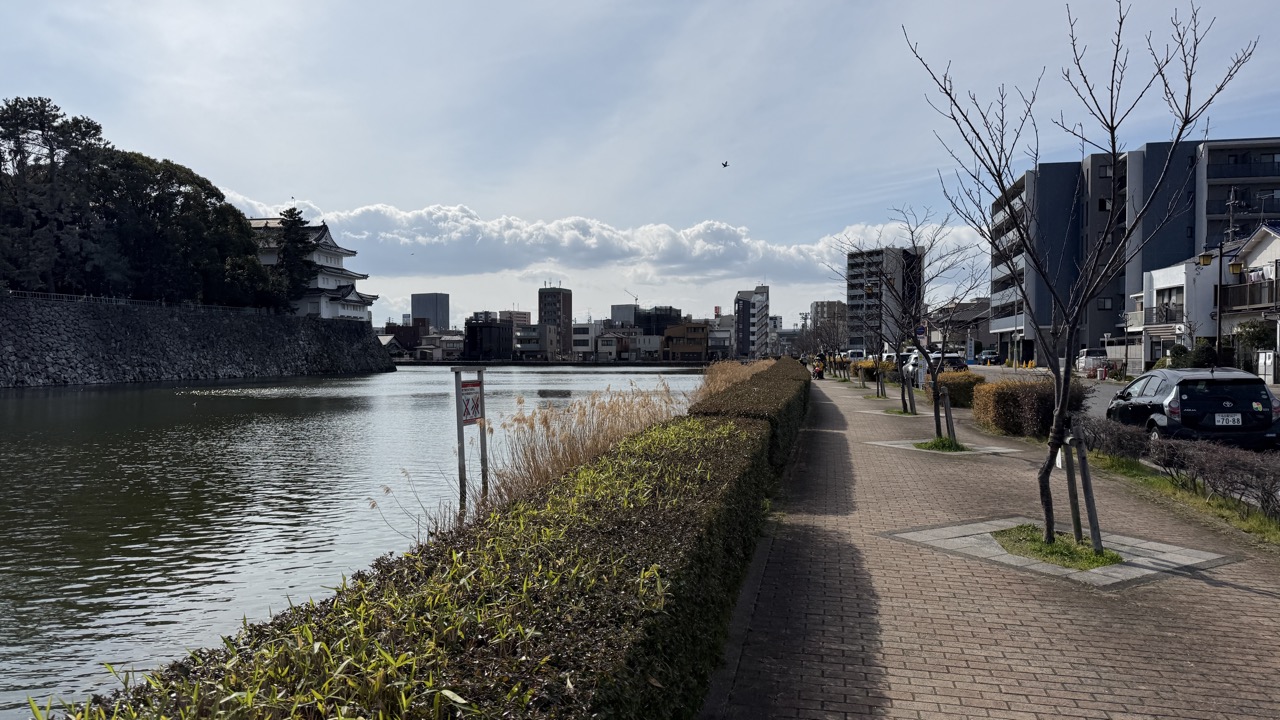 お堀の北側は狭いながらも遊歩道が整備されていて、水辺を走ることができます。