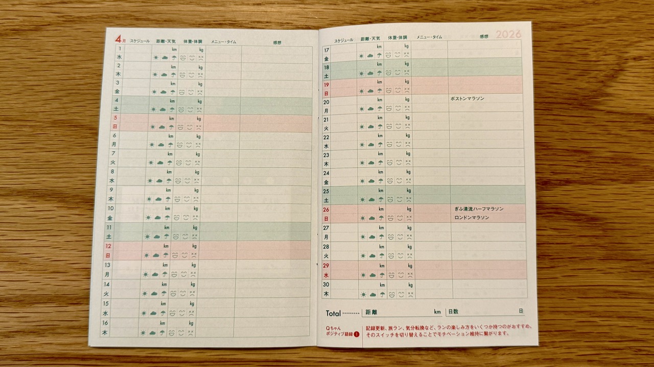 唯一、欠点を挙げるとすれば、ランニングダイアリーがワンサイズ大きいと記入しやすかったと思います。