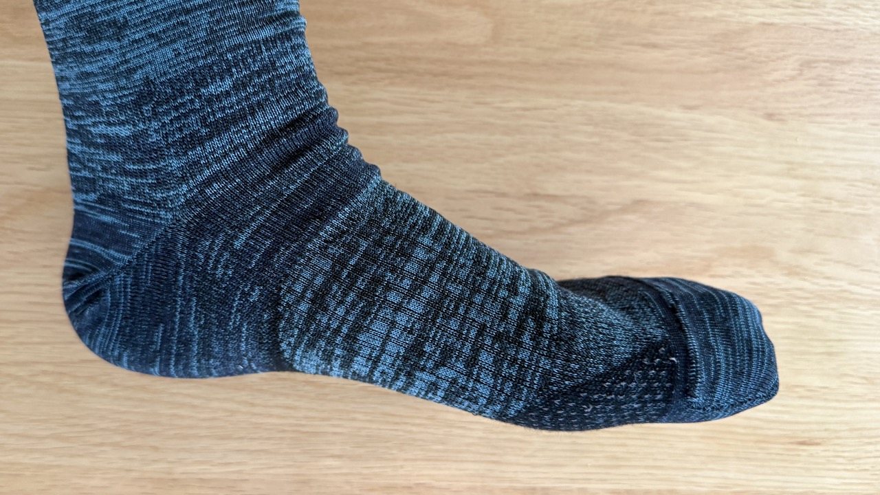 まず足を入れてみて感動したのは、靴下が着脱しやすいこと。履き口の伸縮性が非常に高く、足がスルッと中に滑り込みます。なのに着用中のホールド感は抜群。履き口の内側に配置したグリップ素材に秘密があるようです。