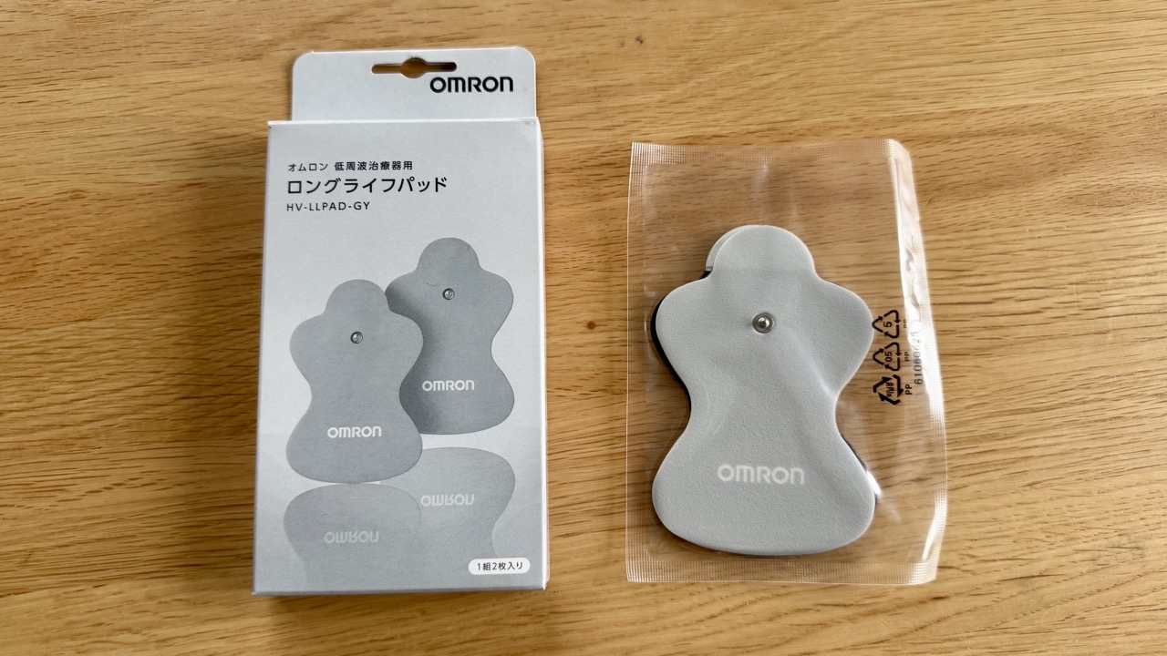 オムロンの純正品「ロングライフパッド」は単体でも購入可能。Amazonで「HV-LLPAD-GY ロングライフパッド」で検索すると、1組2枚が1,600円台でした(2025年4月時点)。後日、交換するために購入しました。