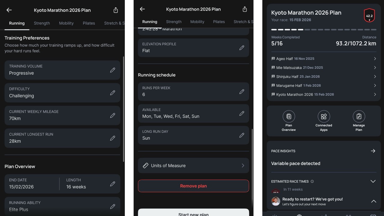 それ以外にも、1週間に走る距離や回数の目安、練習強度や最長距離など、自分の走力や生活パターンをインプットすると、トレーニングプランがより細かくカスタマイズされます。ちなみに私は週6回(木曜日にランオフ)、走行距離70km、最長距離28kmで設定しています。