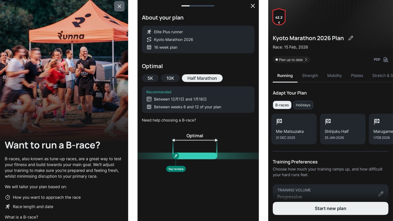 この手のサービスは新しいものではなく、いずれも最新の運動生理学の理論とビッグデータを掛け合わせて、トレーニングプランを生成している点は同じ。ちなみにRunnaの共同創設者のひとり、Ben Parkerは英国陸上競技連盟やIRONMANNの認定コーチでもあります。