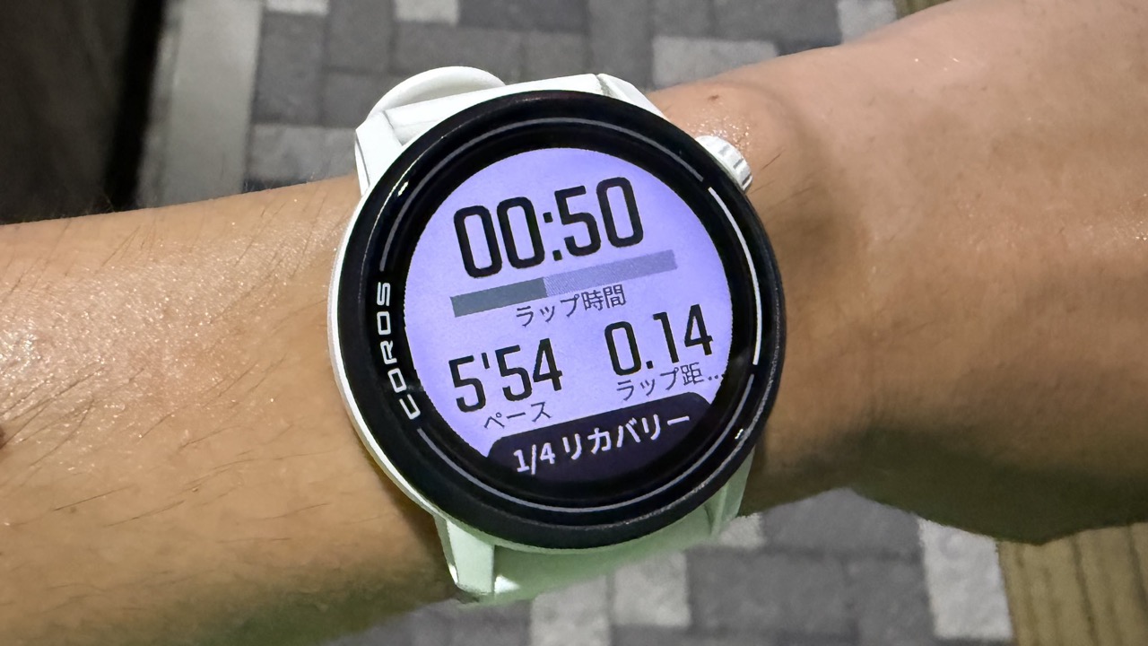例えば1kmインターバル走を5本走る場合、2kmウォームアップ→90秒のレスト→1km(3:00-3:10/km)→90秒のレスト→1km(3:00-3:10/km)…、というように、今やるべきことがランニングウォッチのディスプレイに表示されるため、アプリを確認する必要がありません。