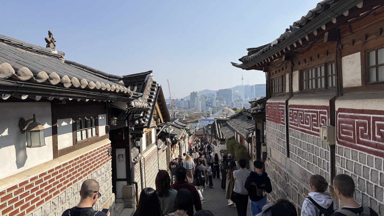 公園を出ると、次は北村韓屋村を目指します。昔ながらの韓国の街並みが美しいエリアとして観光客に人気ですが、日中は混雑していて歩くのもままなりません。