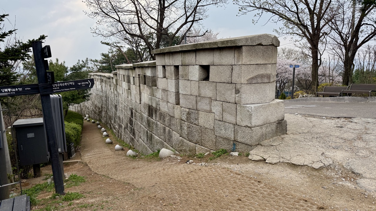 長い階段を登っていくと、石造りの城壁が見えてきました。朝鮮王朝時代の城壁の北側あたり。この近くに北側の正門、北大門(粛靖門)があります。