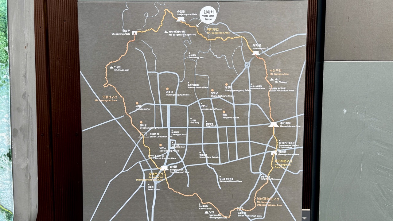 城壁の地図を発見。なるほど、こんな感じなんですね。南西の南大門から北の北大門の近くまで、ソウル市内を縦に横断した形になります。