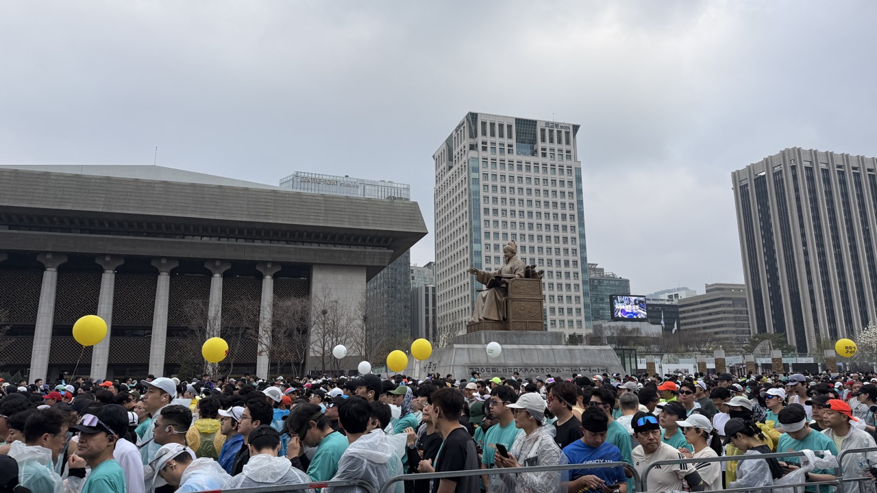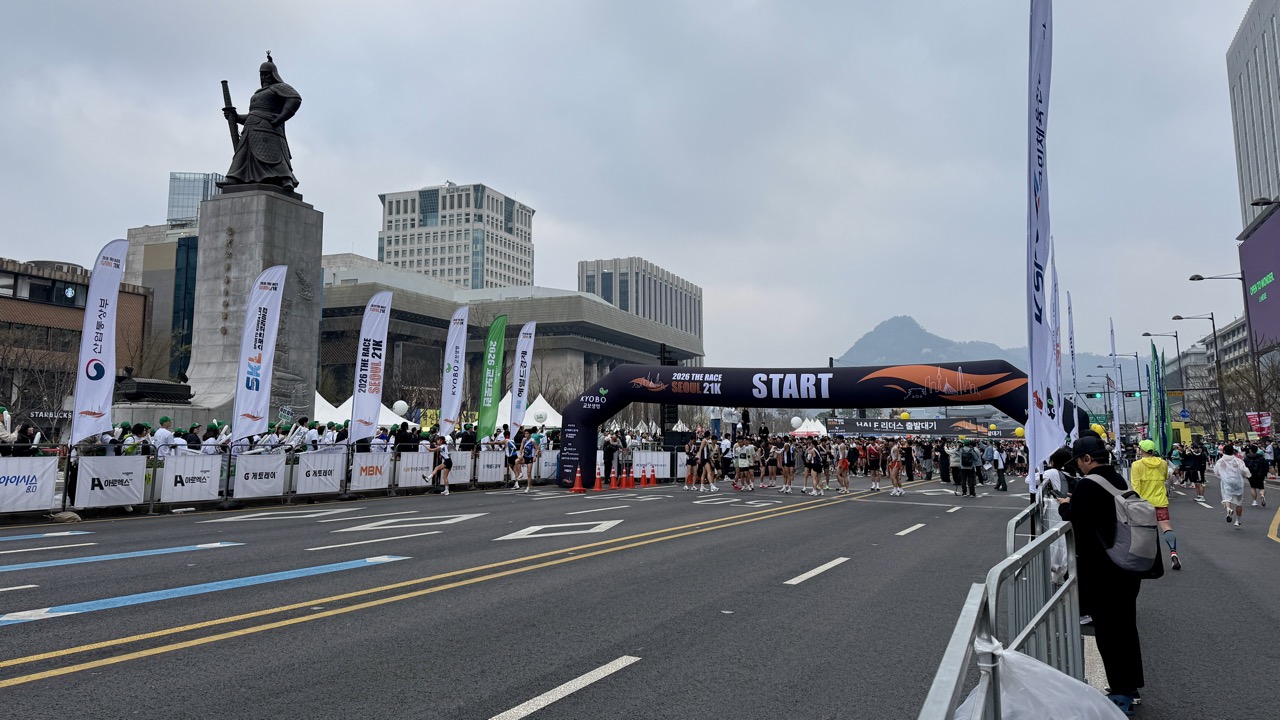 大通りを北へ向かって走り続けると「世宗大路」に出ました。この辺りからランナーをちらほらと見かけますが、みんな同じTシャツを着ています。さらに進むとマラソン大会のスタート地点が見えてきました。もしかしてソウルマラソン?いや、でも3月に開催されたばかりでは?