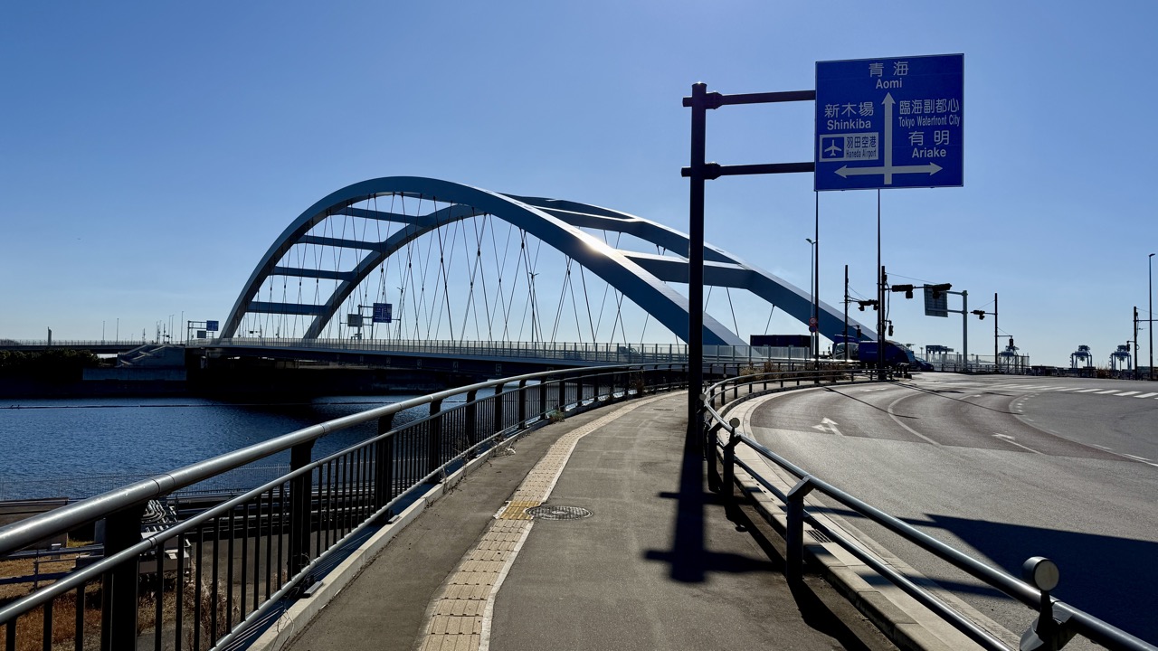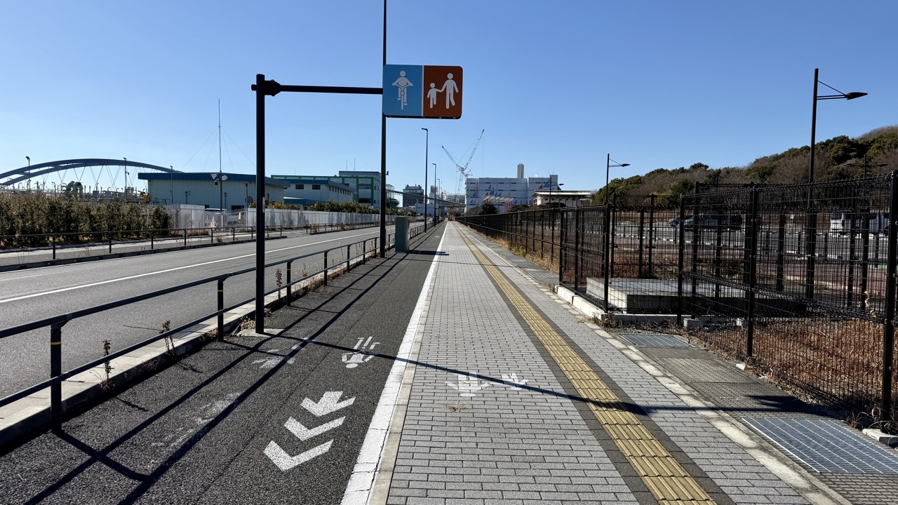 これから東京ゲートブリッジを渡りますが、道路の方は自転車・徒歩ともに通行できませんが、昇降タワーを経由して歩道を歩いたり、自転車を手押ししたりすることはできます。