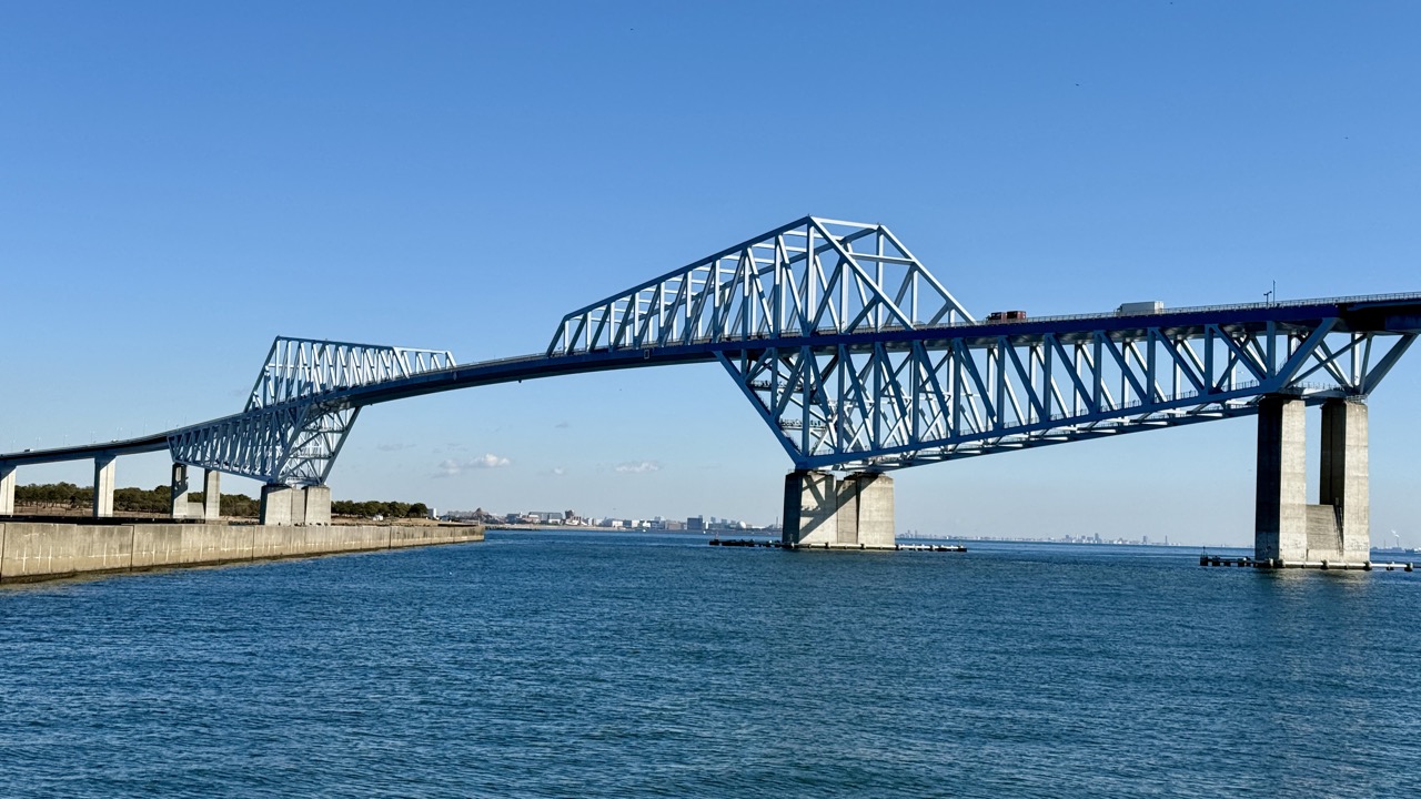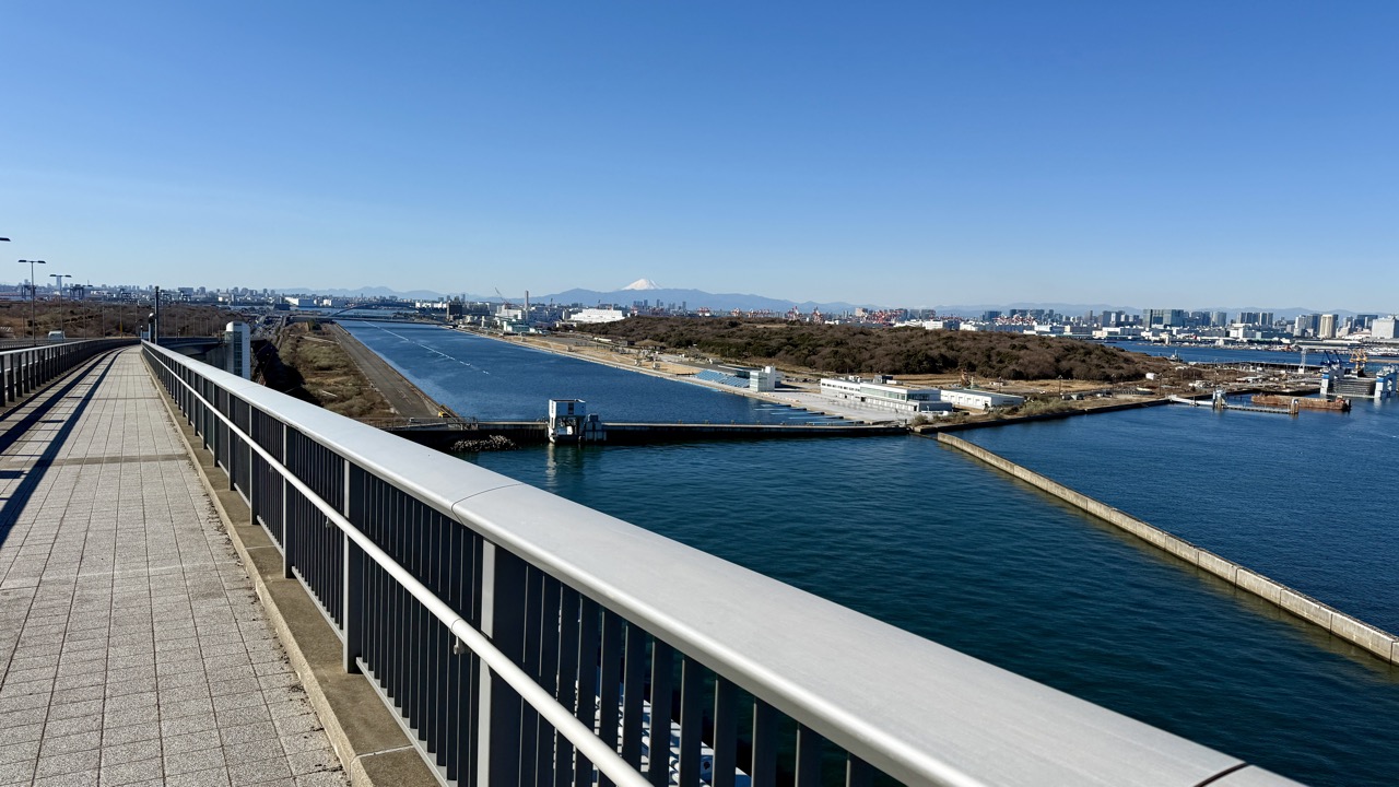 橋に上からは東京都心部のスカイラインが一望でき、天気が良い日は富士山もクッキリ見えます。また近くに羽田空港があるため、数分おきに飛行機が頭上を通過していきます。