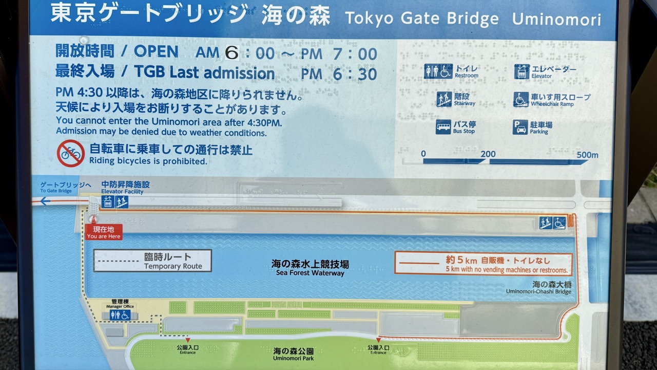 東京湾中央防波堤に到着。ここから海の森公園の中央入口までは海の森大橋を渡って5kmほど。ただし臨時ルートを通行すれば近道できます。