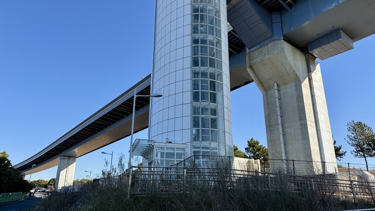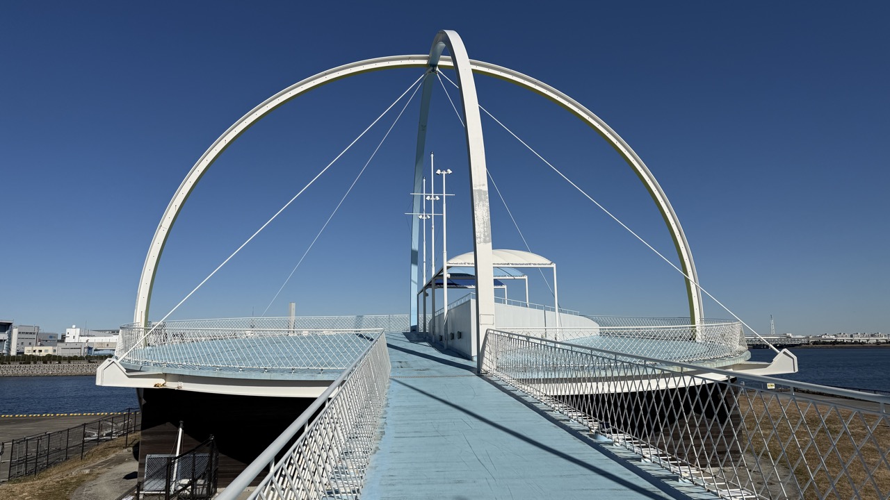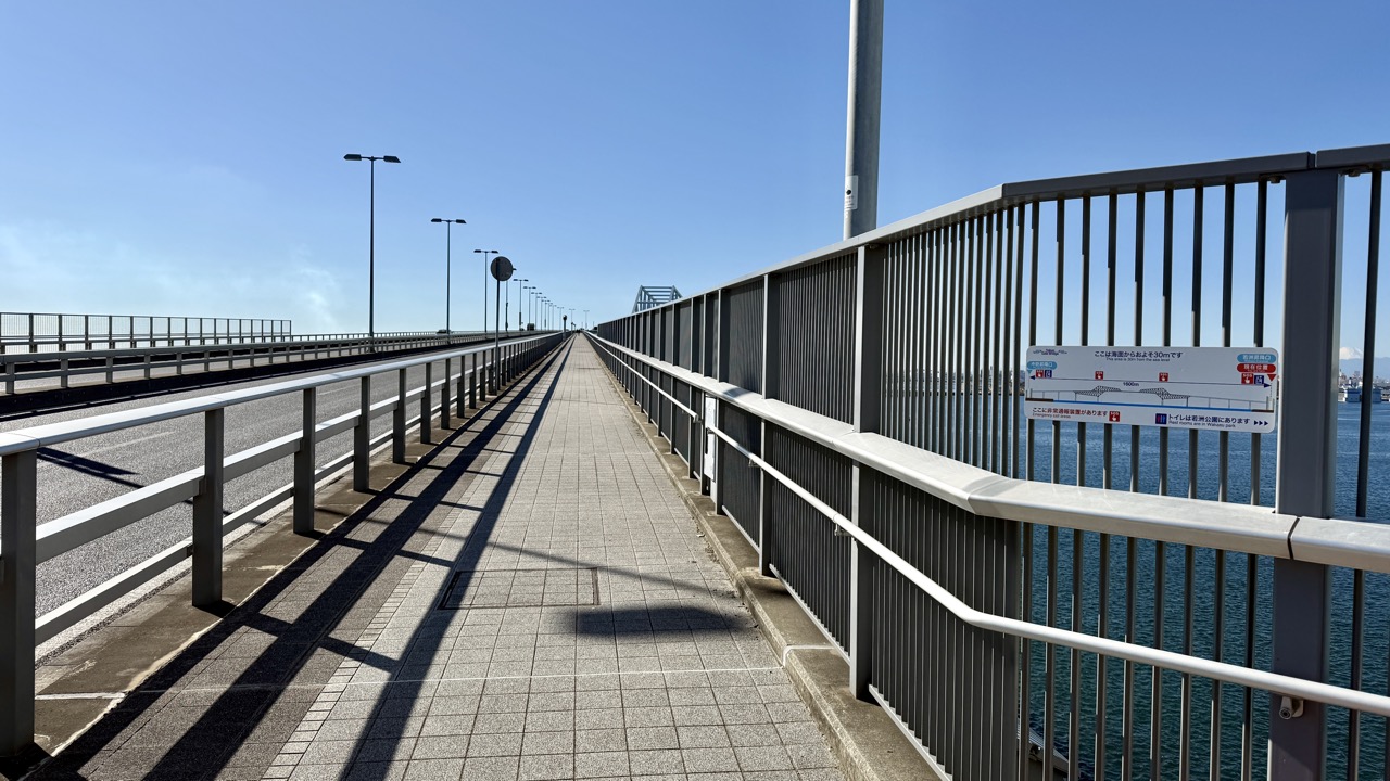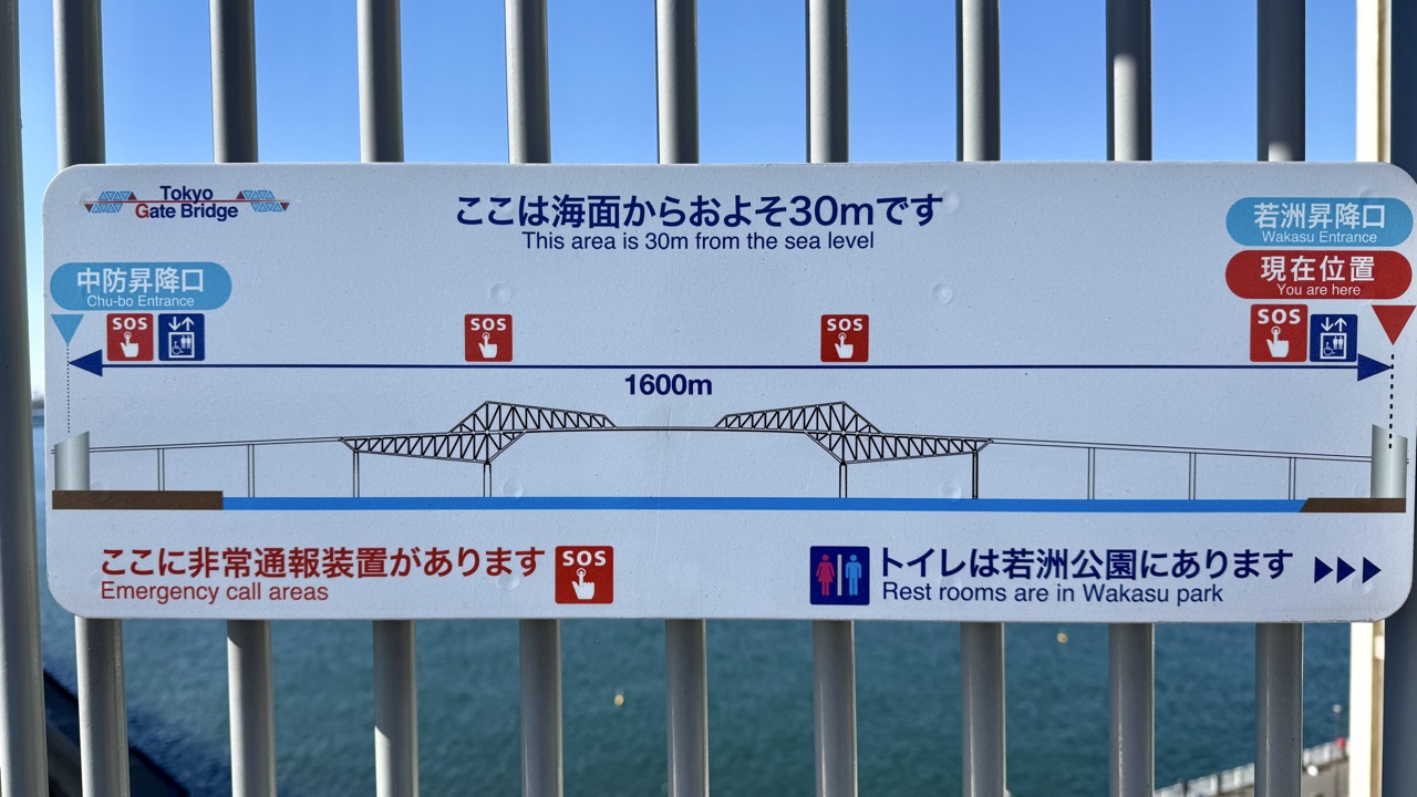 若洲側の昇降タワーは海抜約30m(ビル8階)の高さから走り始めます。橋の全長は約2.6kmありますが、昇降タワー間の距離は1.6km。橋の中央に向かって緩やかな上り坂となります。