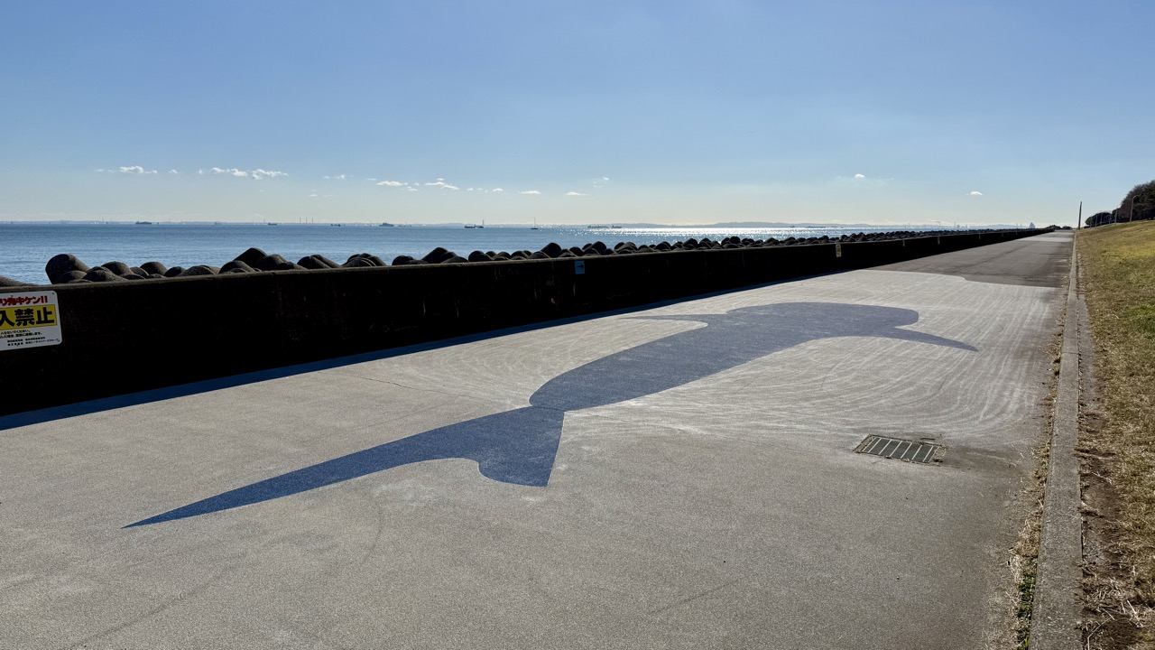 サイクリングコースの足元には、ジンベイザメやクジラ、ジュゴンなど海の生き物のモチーフが描かれています。こちらは「海獣の道」というコンセプトの屋外美術館。単調な一直線のコースを走る者を楽しませてくれます。